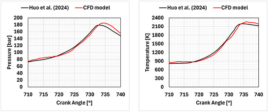 The potential of the numerical approach applied to a large engine equipped with a pre-chamber has also been evaluated, reproducing the results published by Huo et al. [23]. These authors calculated the combustion development under various conditions in an engine fueled with an ammonia–hydrogen mixture, characterized by a displacement of 65.32 L per cylinder, a geometric compression ratio of 11.25. The main combustion chamber featured a piston bowl similar to that of diesel engines, while the pre-chamber, considered as a reference for this study, is active through the injection of a certain quantity of hydrogen. This engine has been discretized with the same approach described in Section 2.5, and the initial and boundary conditions were replicated following the details reported by the authors. Figure 7 shows the pressure and temperature curves calculated for a hydrogen amount equal to 20% by volume and an equivalence ratio in the main chamber equal to 0.6. The proposed model still presents a good agreement with the reference results; there is only a slight overestimation of both the pressure and temperature peaks. This encourages the authors to use it for the calculations reported in this paper.