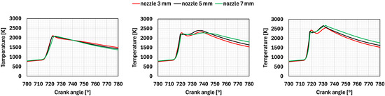 Pre-chamber volume: mean temperature calculated for different equivalence ratios and nozzle diameters (ϕ = 0.7 (left)), (ϕ = 0.8 (middle)), (ϕ = 0.9 (right)).