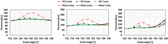 Comparison of mean pressure in the main and pre-chambers for different equivalence ratios and nozzle diameters. (ϕ = 0.7 (left)), (ϕ = 0.8 (middle)), (ϕ = 0.9 (right)).