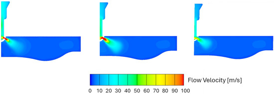 Velocity magnitude for the case with an equivalence ratio of 0.8 and different nozzle sizes (3 mm (left), 5 mm (middle), 7 mm (right)) at a given crank angle.