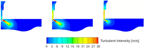 Turbulent intensity for the case with an equivalence ratio of 0.8 and different nozzle sizes (3 mm (left), 5 mm (middle), 7 mm (right)) at a given crank angle.