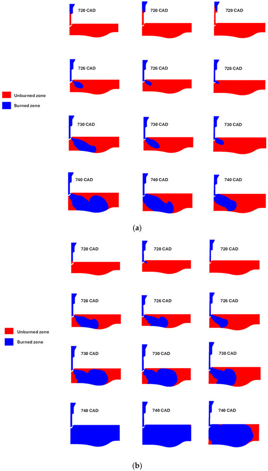 In all the investigated points, the flame initially develops by consuming the whole air–fuel mixture contained within the pre-chamber. The angular duration required to burn 90% of the fuel mass present in the pre-chamber decreases with the enrichment of the mixture, while it is little affected by the nozzle size (Table 6). On average, its value varies from 10° when ϕ = 0.7 to 7° when ϕ = 0.9.