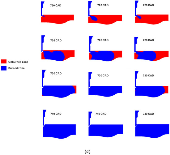 Burned and unburned zone evolution for an equivalence ratio of 0.7 (a), 0.8 (b), and 0.9 (c). From left to right: nozzle diameters 3, 5, 7 mm.