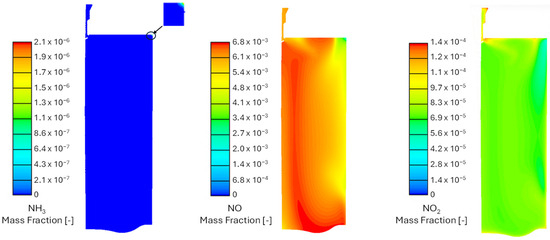 As an example, Figure 14 presents unburned NH3, NO, and NO2 distributions at EVO considering an equivalence ratio of 0.8 and a 7 mm nozzle. It can be clearly noted that the higher concentrations of NO and NO2 are located in the zone that, according to Figure 12, is last reached by the flame front. As expected, similarly, unburned ammonia is concentrated only in the zone that is not completely reached by the flame.