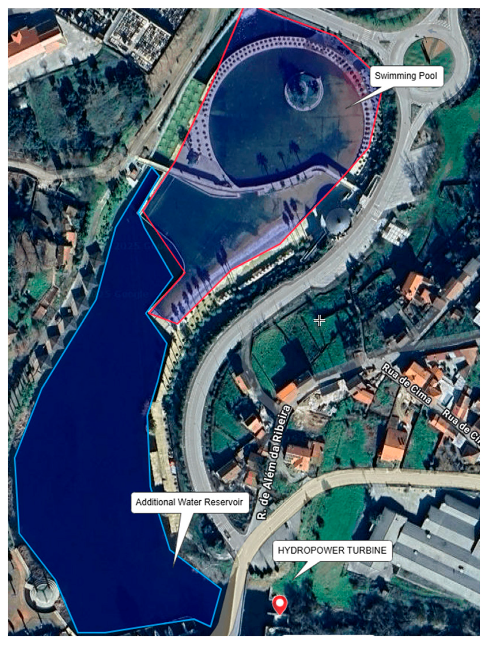 The study site is located at the Castanheira de Pera weir, situated on the Ribeira de Pera in the central zone of Portugal. The reinforced concrete structure, constructed in 2005, spans approximately 35.4 m and creates a gross head of about 3.6 m between upstream and downstream water levels. The weir remains in good structural condition and is equipped with two flap gates for flood discharge and a sliding wall gate for ecological flow regulation. Upstream, the impoundment forms a small reservoir with an estimated surface area of 6160 m2, which provides some active storage capacity. This existing hydraulic infrastructure offers the potential for adaptation into a micro-hydropower facility and for integration into a broader hybrid renewable energy system.