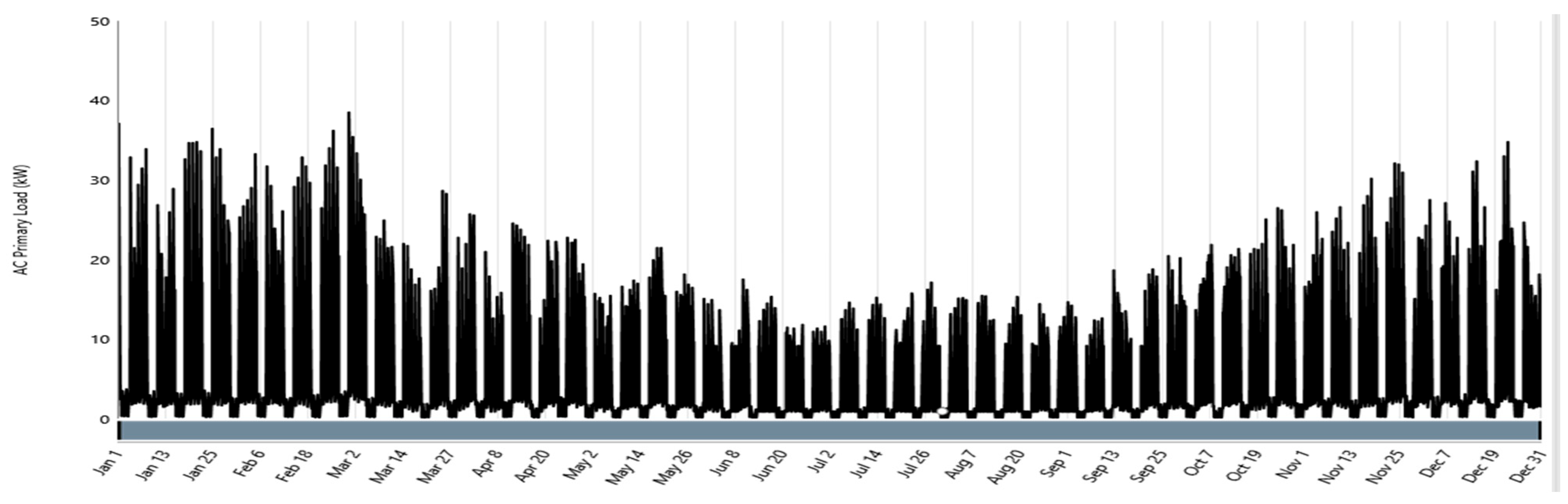 The community’s electricity demand was modeled on an hourly basis (8760 values) for 2026, totaling 48.2 MWh annually, as presented in Figure 6. To capture long-term dynamics, demand growth was projected at 0.5% per year, reflecting the compound annual growth rate of Portuguese households [8]. In parallel, an industrial facility in Castanheira de Pera [9] was incorporated into the system model, with an estimated annual consumption of 213 MWh. Its load profile, generated in Python, follows a weekday schedule of 80 kW during working hours (09:00–17:00), reduced to 30 kW at lunch (11:00–12:00), and 8 kW idle load during nights, weekends, and holidays. Variations in future industrial demand are addressed through proportional scaling in the sensitivity analysis.