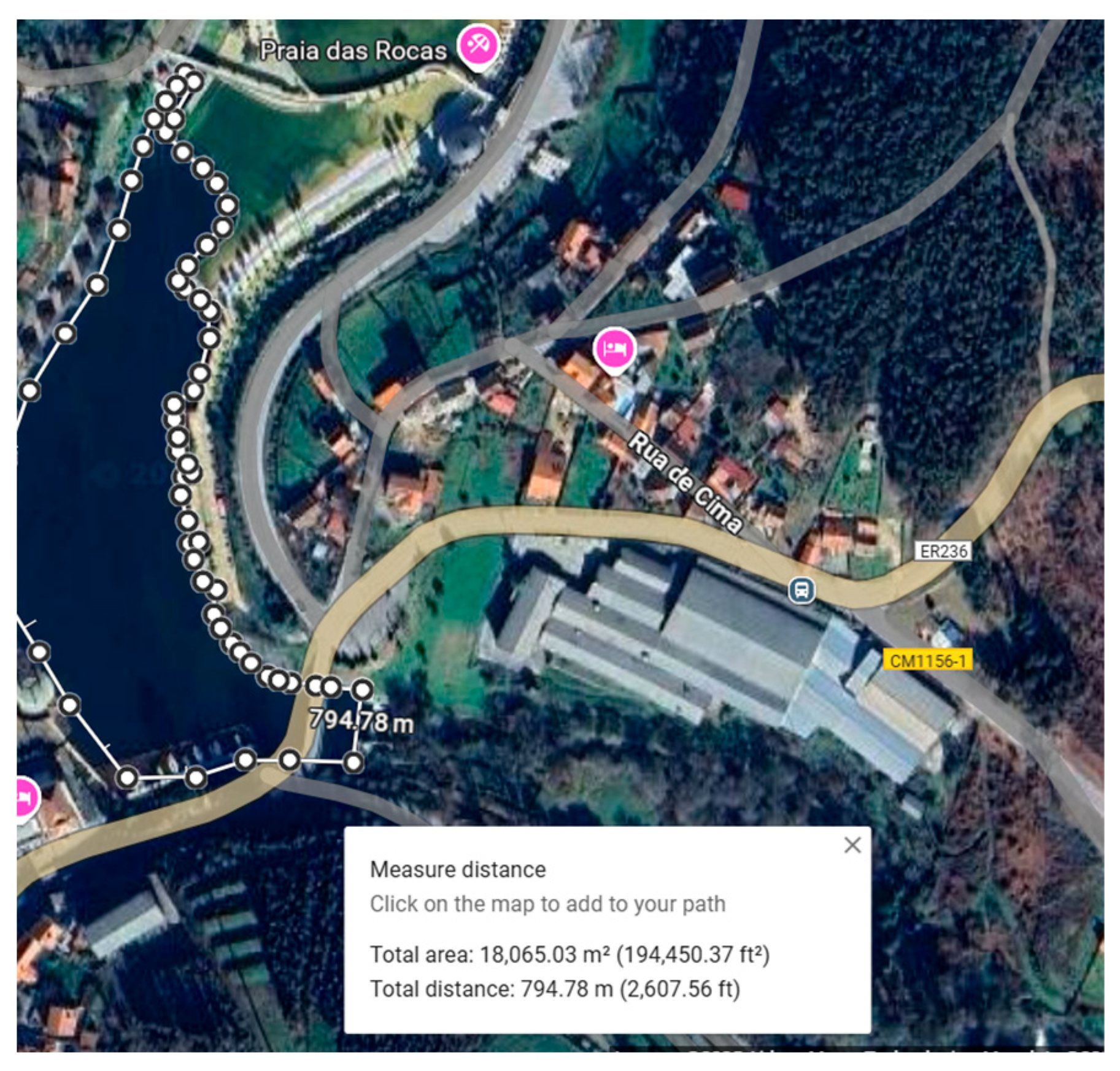Figure 3 represents the view of Castanheira de Pera weir and the downstream view of the flap gate. The upstream impoundment forms a small reservoir, complemented by an additional water storage area, represented in Figure 4, that can be exploited for hydro-buffering. The existing river beach, situated within the weir structure, highlights the multi-functional use of the site. The proposed hydropower turbine location is indicated downstream over the weir, where the controlled outflow from the reservoir can be harnessed for electricity generation.