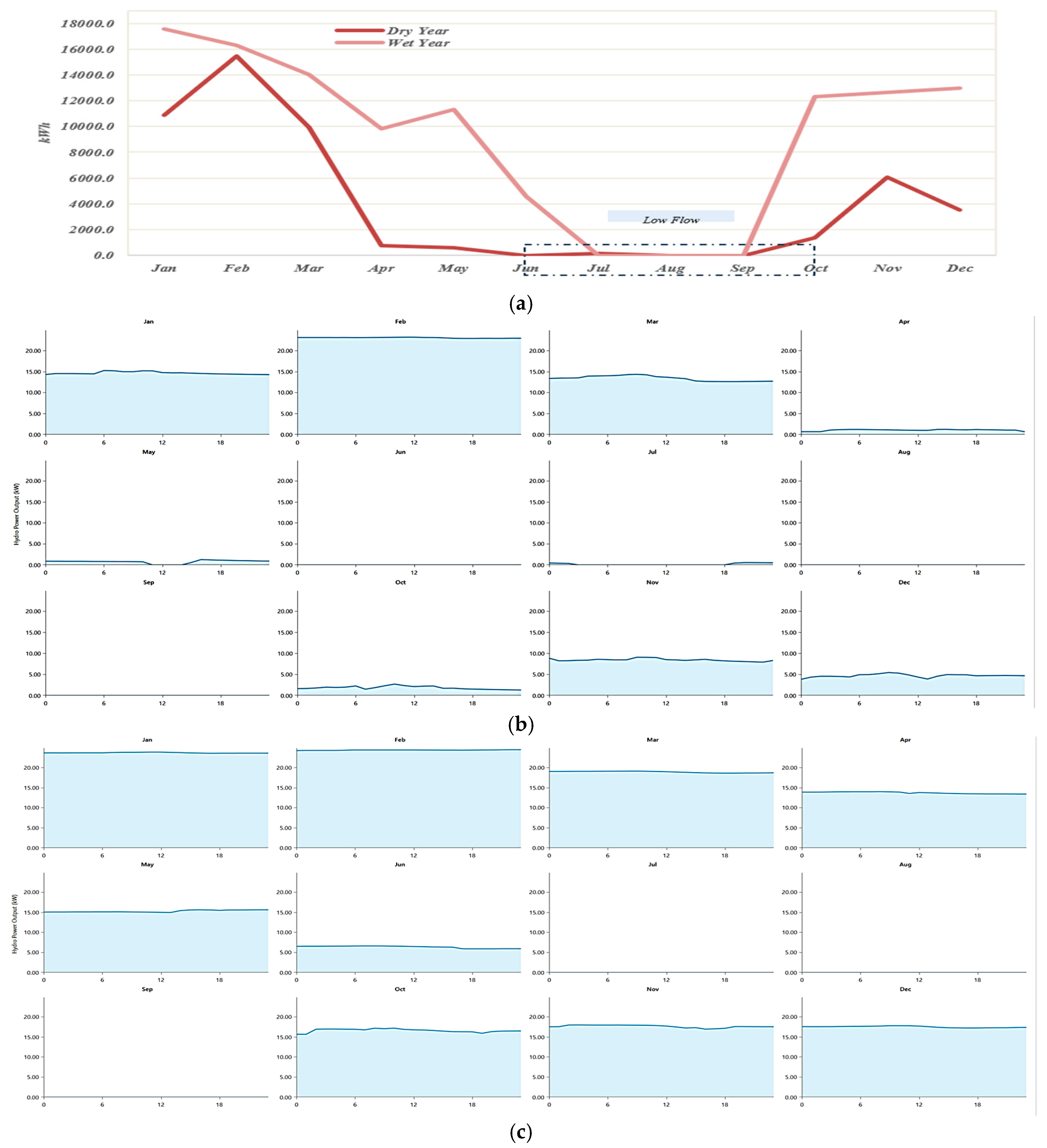 Annual Hydropower generation is illustrated by the monthly energy production under two different hydrological conditions—dry year and wet year. In a wet year, the total annual energy production reaches approximately 111 MWh, while in a dry year, it drops significantly to around 48 MWh (Figure 10a). The variability is clearly reflected in the monthly distribution. Notably, from June to September, there is almost zero power output from the hydropower system in both scenarios. These summer months represent a critical vulnerability period where hydropower alone cannot meet community energy demands. Therefore, this underscores the necessity of designing a robust hybrid energy system capable of compensating for hydropower shortfalls, particularly during low-flow months, by integrating alternative renewable sources like solar or wind to ensure reliability and supply continuity. Figure 10b,c depict the daily hydropower output from January to December.