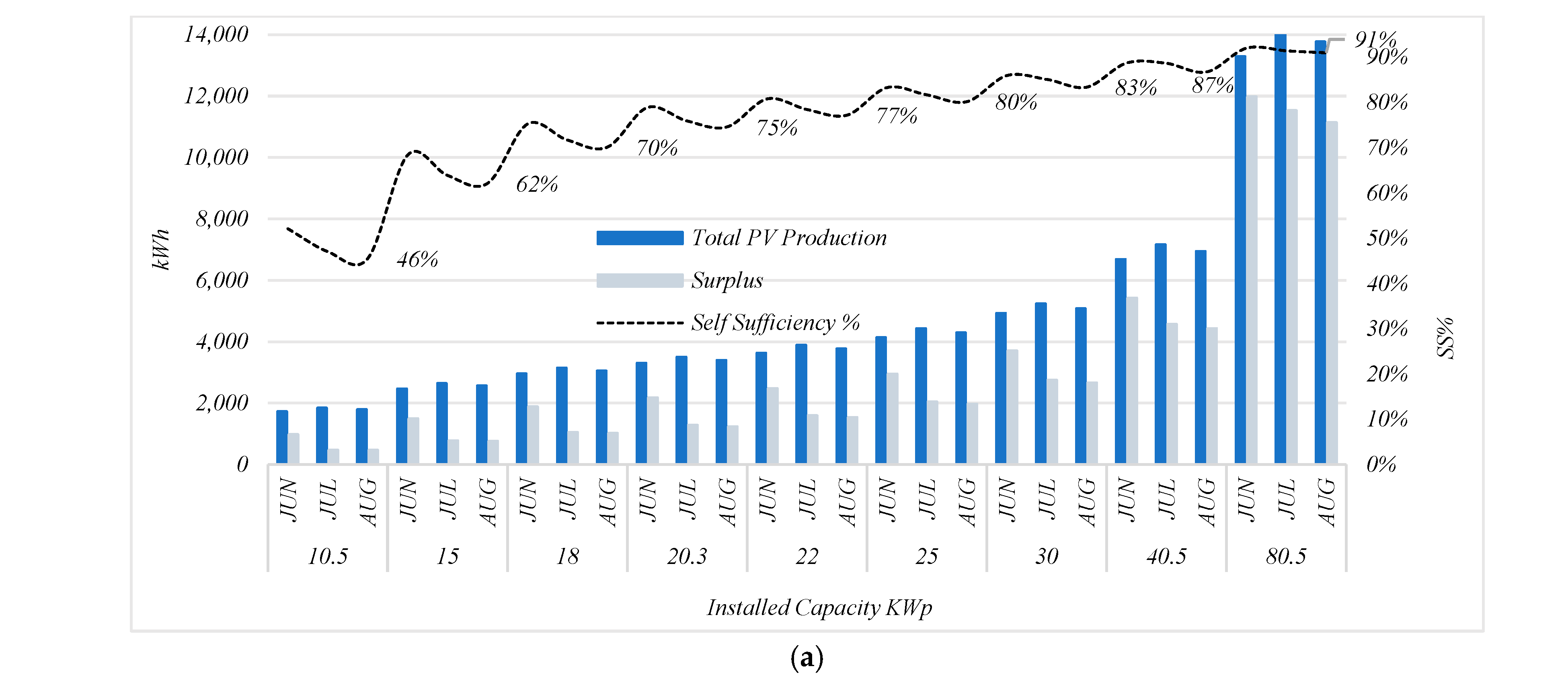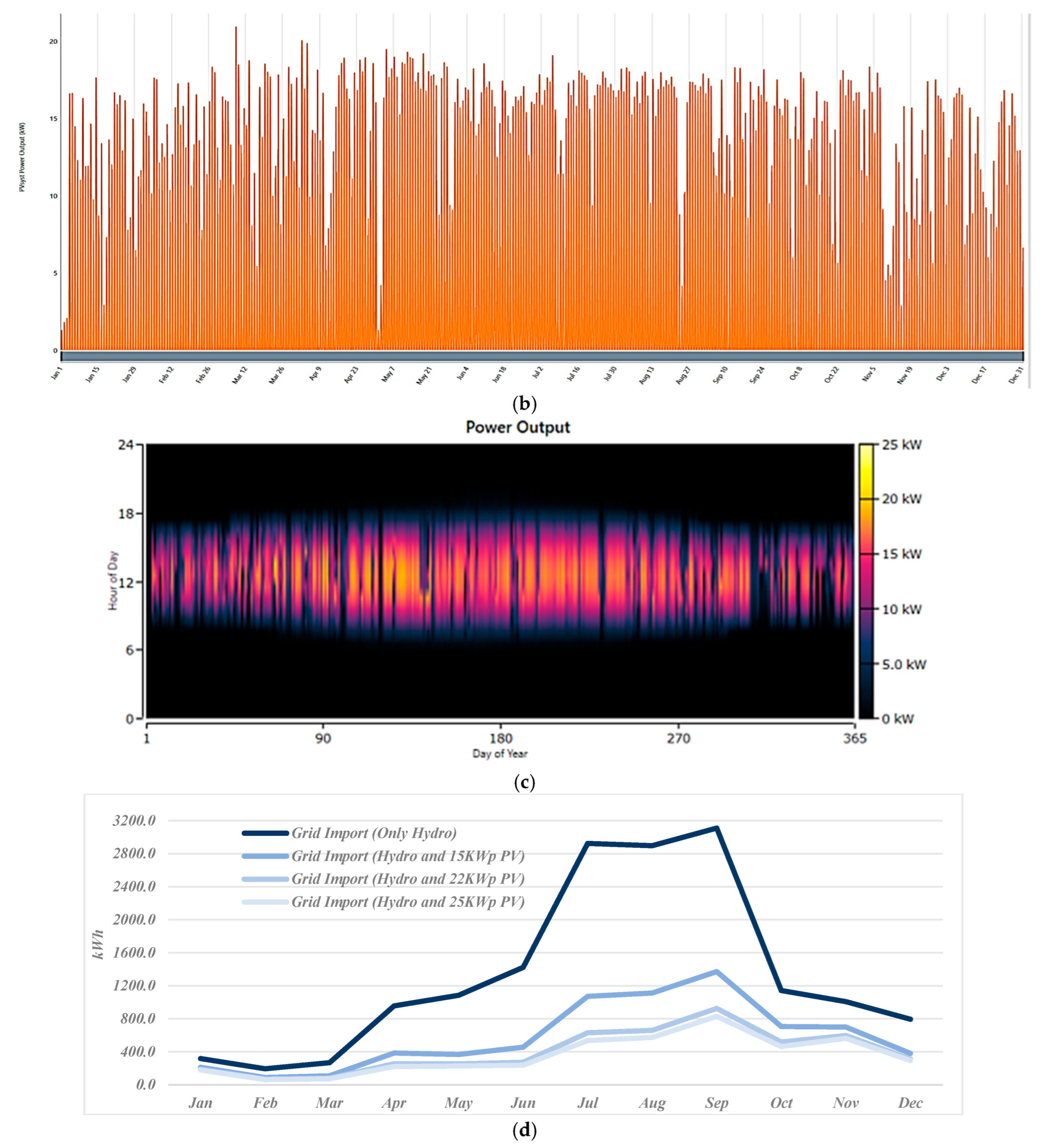 The unmet load data for a wet year scenario was exported to PVsyst for simulation. Various PV capacities—10.5, 15, 18, 20.3, 22, 25, 30, 40.5, and 80.5 kWp—were evaluated for performance during the summer months (June, July, August). As the installed PV capacity increases, the Self-Sufficiency Ratio (SS%) also improves. However, this improvement is nonlinear—for instance, increasing capacity from 40.5 kWp to 80.5 kWp yields only a 2% gain in SS% (from 89% to 91%), indicating diminishing returns. The energy surplus also rises significantly at higher capacities, which may lead to overproduction and curtailment if storage or export mechanisms are not in place. This surplus becomes a crucial factor in optimizing PV sizing—balancing between energy autonomy and system efficiency. The configuration was also tested for annual energy curtailment, PV energy consumption, and overall Self-Sufficiency Ratio (SS%). Based on the results, the capacities of 22 kWp and 25 kWp offer an optimal trade-off, with low curtailment rate, high PV utilization, and up to 80% SS% during summer months. These values make them suitable candidates for further sensitivity analysis and financial optimization in hybrid energy system designs. Grid import refers to the electricity that the community must draw from the public grid when the available renewable energy (hydropower and solar PV) is insufficient to meet its demand. As illustrated in Figure 11d, the integration of photovoltaic (PV) capacity alongside hydropower leads to a substantial decrease in grid import, especially during the critical low-flow summer months (June to September) when hydropower alone is insufficient to meet community demand. The configuration combining hydropower with 25 kWp PV achieves the highest performance, reaching an annual Self-Sufficiency Ratio of 91.2%. In comparison, the setup with 22 kWp PV reaches 90%, while 15 kWp PV results in 85.5%.