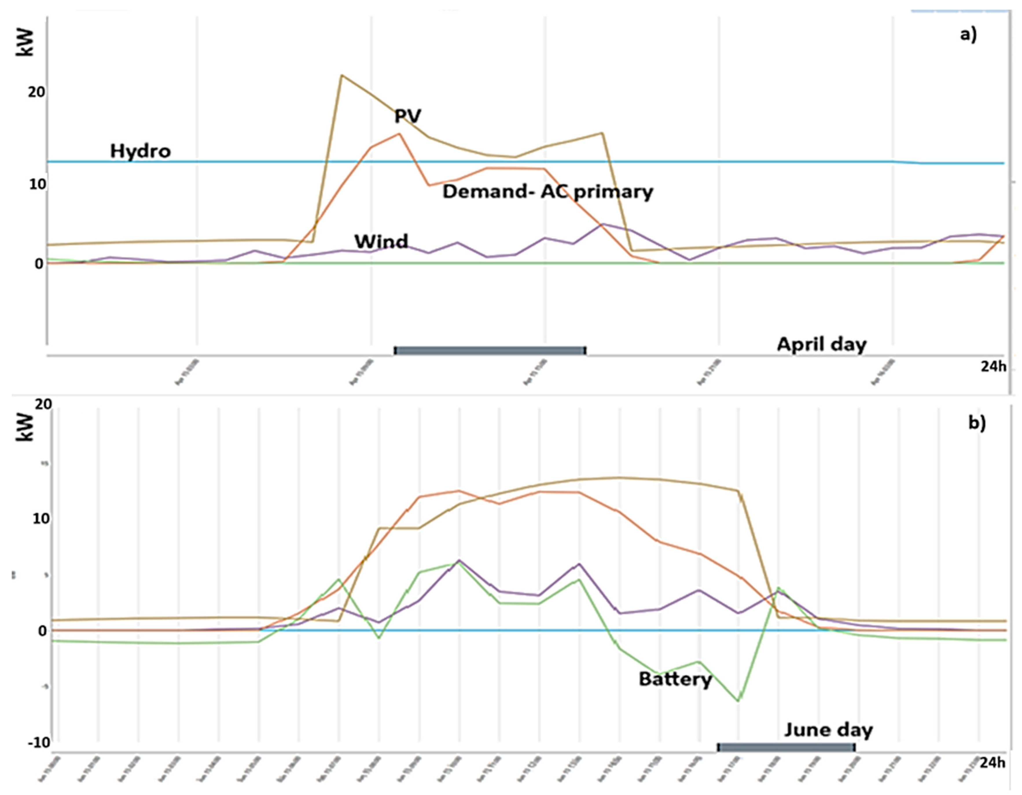 To evaluate the performance of different technology mixes, a series of hybrid energy system configurations were developed and simulated in HOMER Pro (Figure 8). Each configuration combines hydropower with varying capacities of photovoltaic (PV), wind, and battery storage, reflecting both realistic deployment options and stress-test scenarios for system robustness. In total, fourteen distinct configurations (C1–C14) were considered. Table 1 shows the hybrid configurations setup, ranging from a hydro-only baseline (C1) to a full system capacity option integrating hydro, PV, wind, and battery storage (C14). Intermediate cases include PV-optimized setups, wind-dominated scenarios, and configurations with different levels of battery integration. The hydro capacity was fixed at 24.7 kW across all cases, while PV capacity ranged between 15 and 25 kWp, wind turbine contributions varied between 5 and 20 kW, and battery storage was scaled from 10 to 20 kWh.