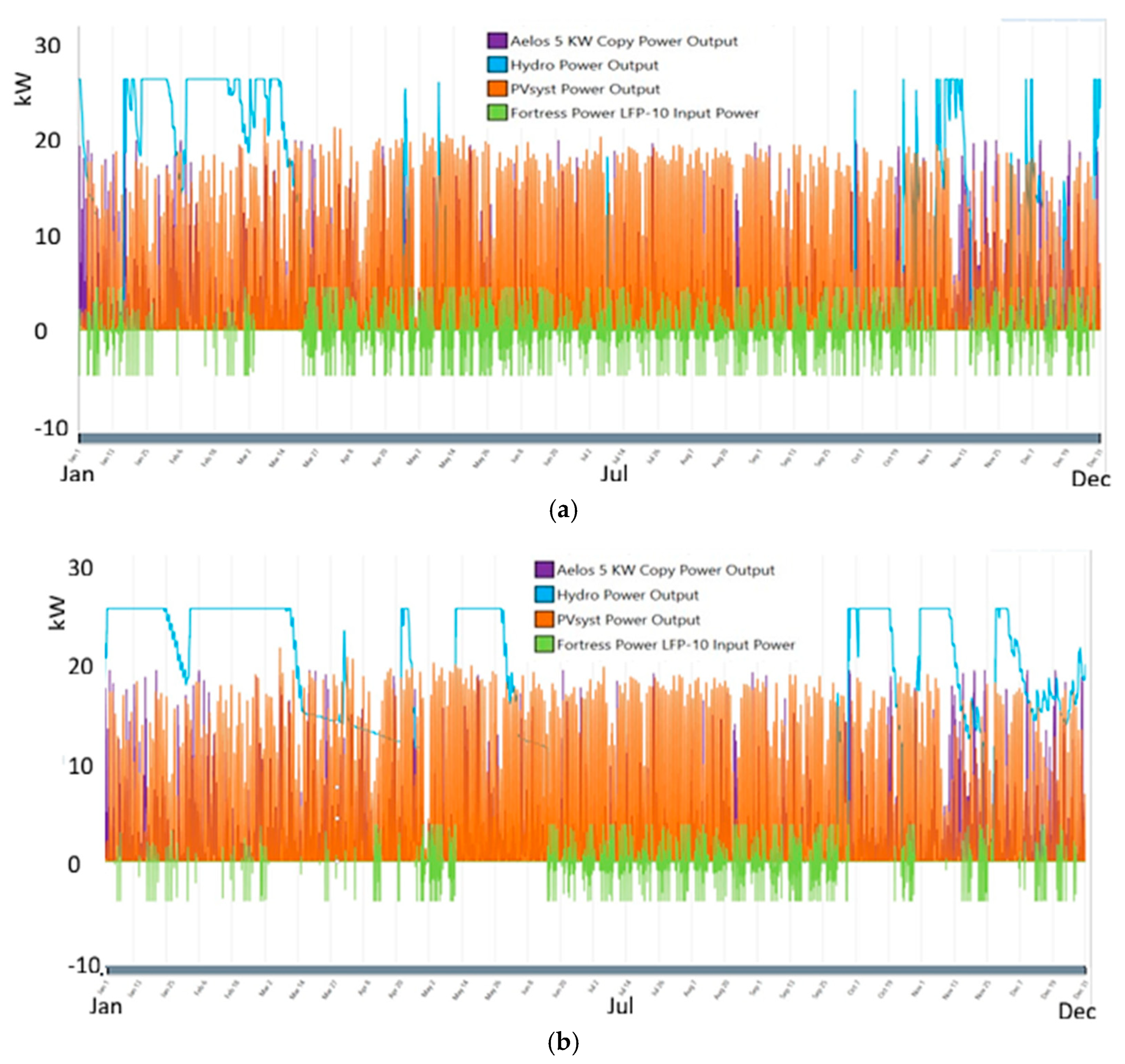 Figure 19. Power output from hybridization: (a) dry year; (b) wet year.