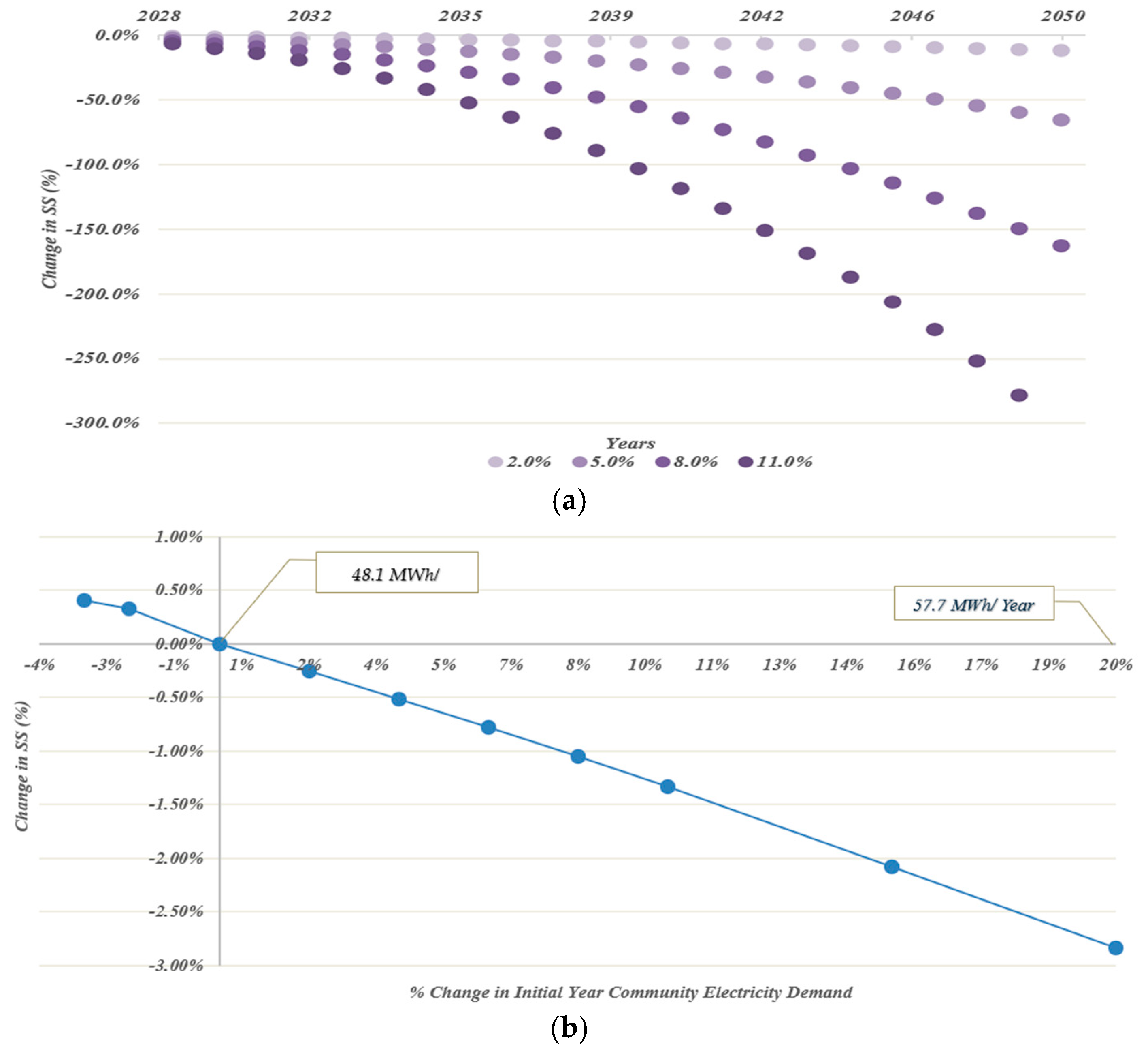 Figure 25. SS (%) sensitivity: (a) with the % yearly community electricity increment; (b) for the initial year load level.
