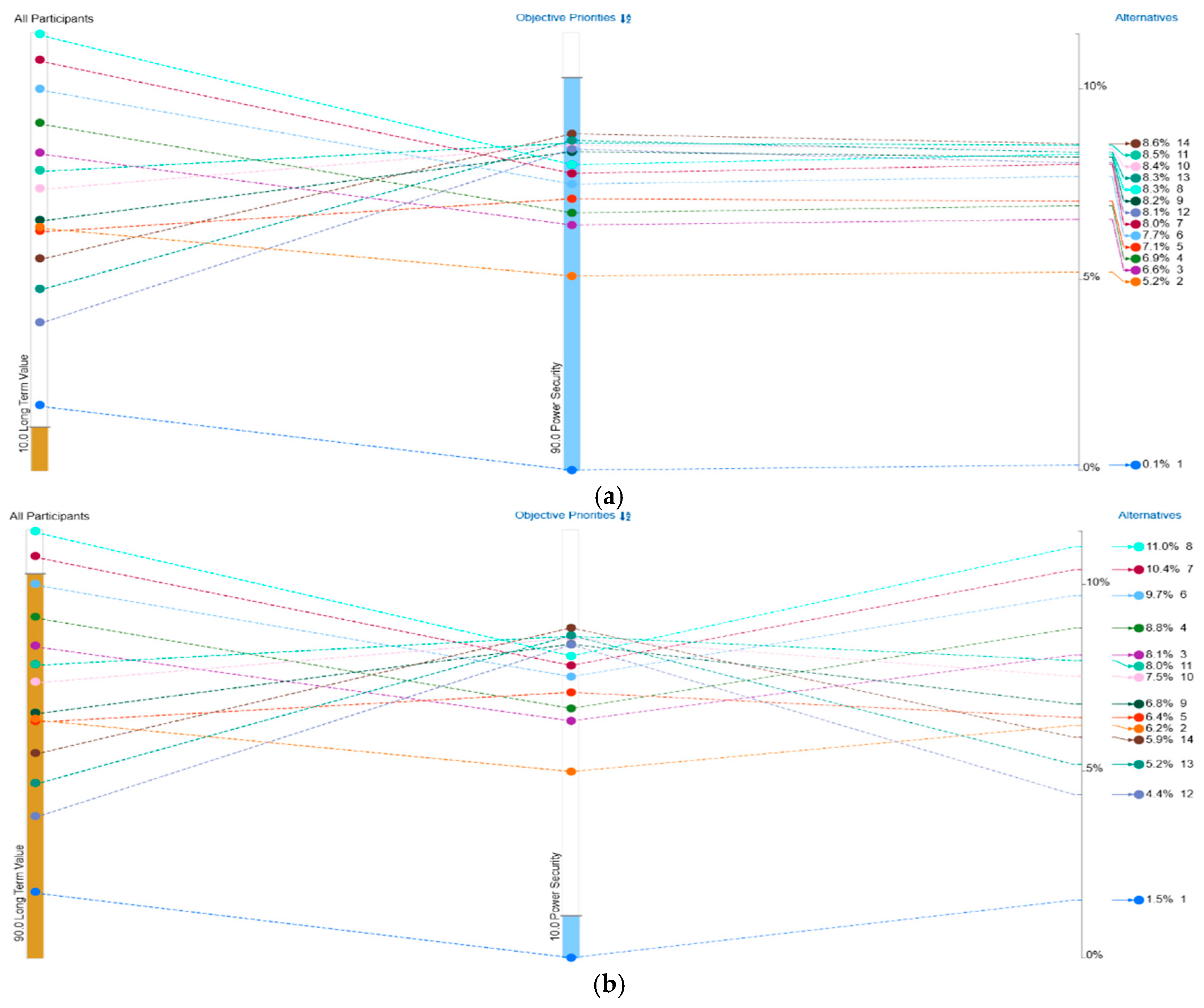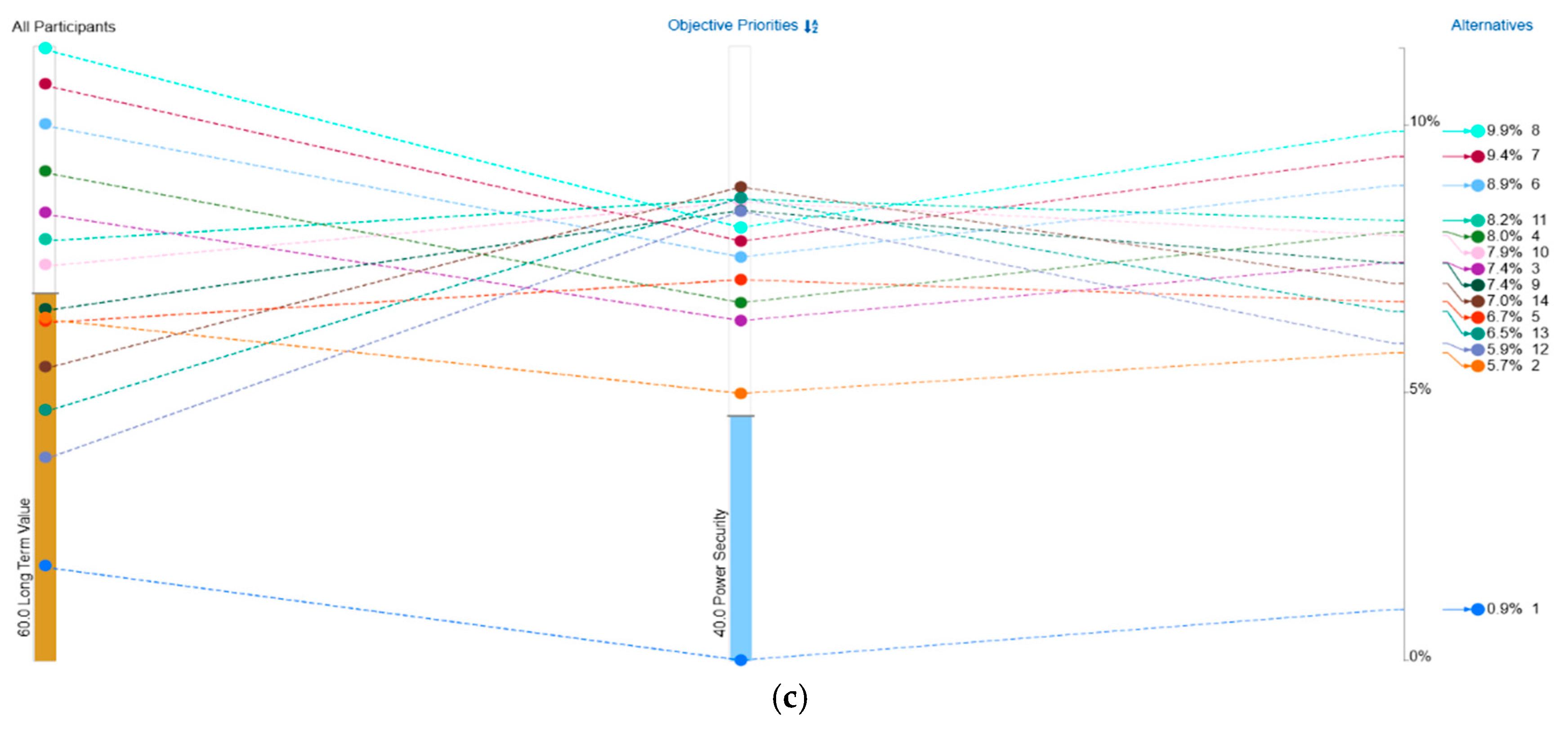 Figure 28. Multi-Criteria Decision Comparison (MCDC) by Analytical Hierarchy Process (AHP) for all the configurations (C1-C14): (a) Power Security config ranking; (b) Long-Term Profit config ranking; (c) Balanced Approach config ranking.