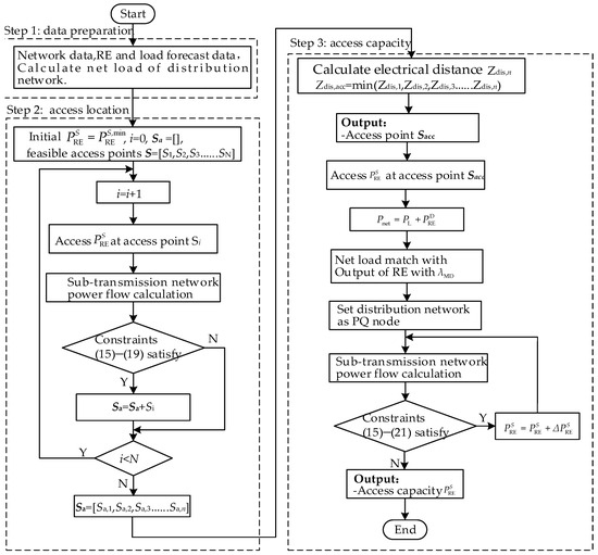 There are two key measures to maximize the sub-transmission network HC. First, choose the access point with the shortest electrical distance, as shown in Equation (13); second, match the net load with RE output, as shown in Equations (20) and (21).