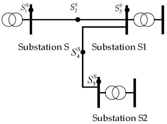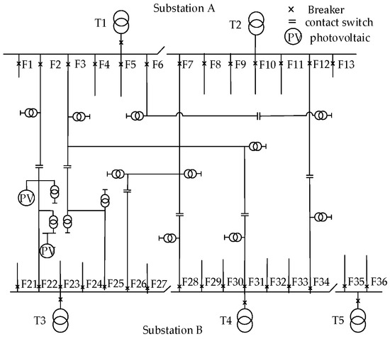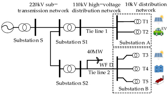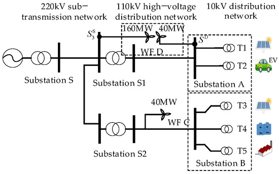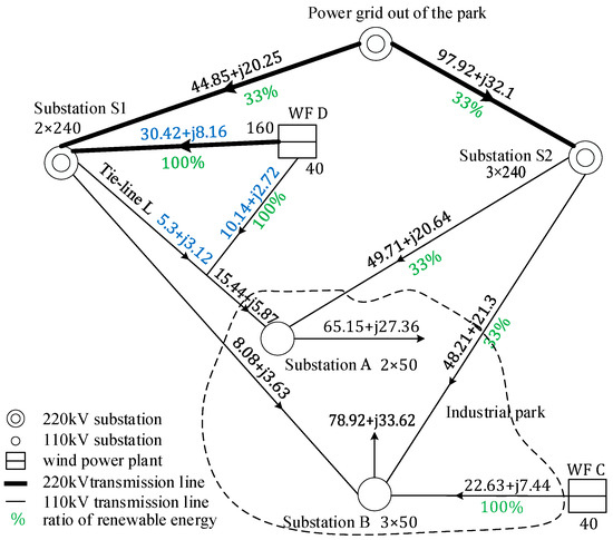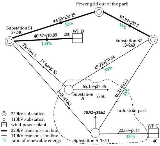 In the following analysis, consider the example of an industrial park in Tianjin, China, with an area of 18.8 km2. The load is mainly industrial and commercial, with an annual electricity consumption of 353.77 million kWh in 2023. There are two 110 kV substations in the park. The current power grid structure of the park and its surrounding area is shown in Figure 4. All conductor types from substations S1 and S2 to substations A and B are LGJ-300. There is a 40 MW wind farm (WF) C, located 5 km away from the park. WF C connects to the 110 kV high-voltage distribution network outside the park.