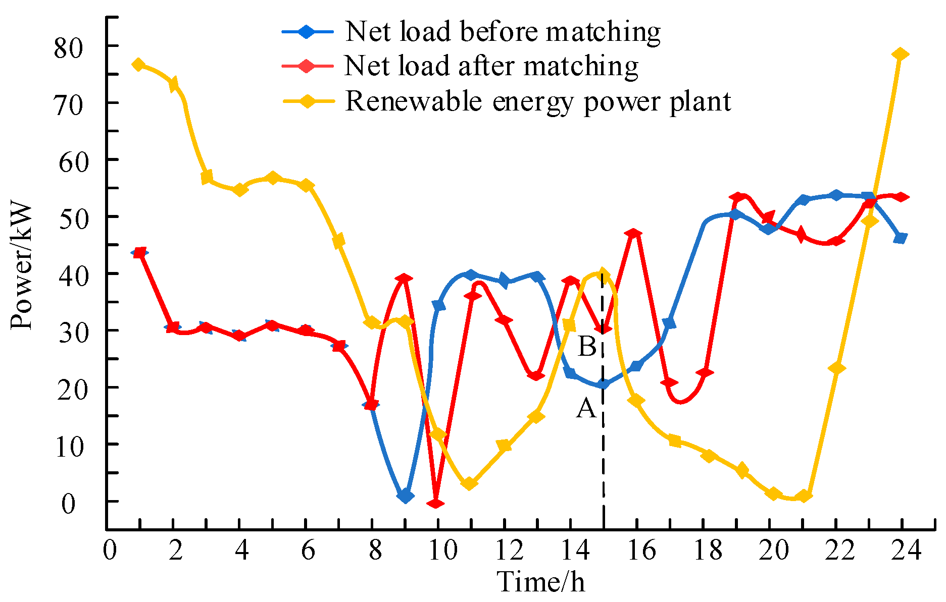 - Shift the load of the park through the matching method to the time when the output of renewable energy is at its peak. At 15:00, when WF D is at its peak, the load is increased from 82.3 MW to 100.8 MW to match the peak output of WF D, as shown in points A and B in Figure A4.