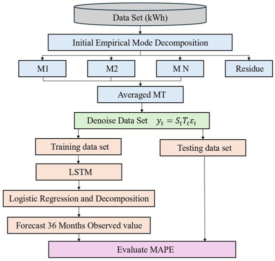 The process of forecasting energy consumption trends in the food industry begins with the collection of monthly data on production volume and electrical energy consumption over a 24-month period, from January 2023 to December 2024. The relationship between production volume and electrical energy consumption is then analyzed using linear equations, which serve as reference models for estimating the expected energy consumption based on the actual production levels. The estimated energy consumption values are compared with the actual consumption values to determine the deviations, which are subsequently analyzed using a CUSUM. The cumulative differences obtained from the CUSUM analysis are used to forecast energy efficiency trends for the subsequent 12 months. In addition, as previously reported [27], a Long Short-Term Memory (LSTM) deep learning model is employed in this study. The LSTM network, designed to emulate human memory patterns, processes the CUSUM energy data to identify significant positive and negative deviations within each time period. The algorithm selectively retains crucial information while discarding less relevant CUSUM values, thereby enhancing forecasting accuracy. This time series analysis approach is suitable for sequential data processing and is implemented using Python’s Scikit-learn (Python 3.12.0, Scikit-learn 1.7.1) and Time Series Forecasting libraries. This study utilizes the decomposition method, logistic regression, and actual observed data to compare the performance of both models. The forecasting accuracy is evaluated based on the MAPE, as shown in Figure 1.