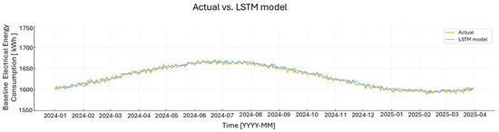 Figure 3 shows a comparison between the actual daily electrical energy consumption and the forecasted values generated by the LSTM model from January 2024 to March 2025. The forecast line closely overlaps with the actual values for most of the period, demonstrating the model’s high accuracy and stability. Electrical energy consumption exhibited an increasing trend from March to August, followed by a decline after September, which aligns with the seasonal production characteristics of the food industry. The LSTM model effectively captured this pattern, achieving a MAPE of 1.84%.