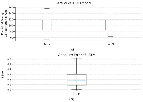Figure 4 shows (a) the comparison between the distribution of actual electrical energy consumption and the predicted values obtained from the LSTM model and (b) the distribution of absolute error values. As shown in Figure 4a, the medians of both the actual and predicted data are closely aligned at approximately 1050 kWh, with similar interquartile ranges (IQRs). This indicates that the LSTM model can accurately capture the energy consumption trend, achieving a MAPE of 4.7%, which represents an acceptable level of forecasting accuracy for practical applications in the food industry. In Figure 4b, most of the absolute error values are concentrated below 0.19, with no significant outliers, demonstrating the stability and robustness of the model. The LSTM’s capability to retain long-term sequential information allows it to effectively learn energy consumption patterns associated with production cycles and seasonal variations. The results of this analysis suggest that the LSTM model has strong potential for application as a decision-support tool in energy management for food industry facilities, contributing to enhanced energy efficiency and reduced production losses. Subsequently, the LSTM model was applied to forecast the DIFF between the decomposition and logistic regression forecasting models, as illustrated in Figure 5.