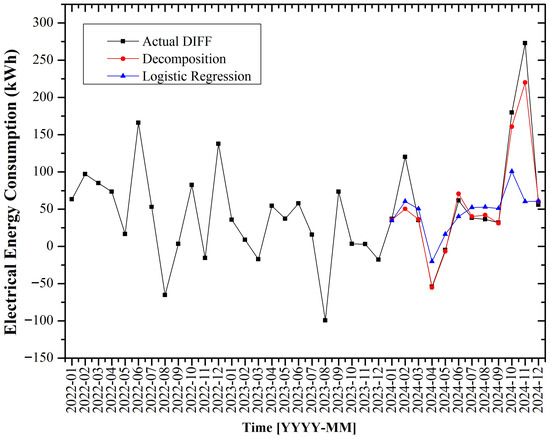 From Figure 5, which shows the forecasted DIFF values from January to December 2024, it is evident that the decomposition model consistently produces forecasts that are closer to the actual values than those of the logistic regression model. The divergence between the two models becomes particularly pronounced during the final quarter (October to December), where the decomposition model maintains higher accuracy, whereas the logistic regression model consistently underestimates the actual values. These results suggest that the decomposition model provides a more reliable forecast of electrical energy consumption efficiency trends. The discrepancies observed in both models during the early months of 2024 (January to March) may be attributed to overfitting, potentially caused by excessive sensitivity to minor fluctuations in the training data or increased model complexity [32].