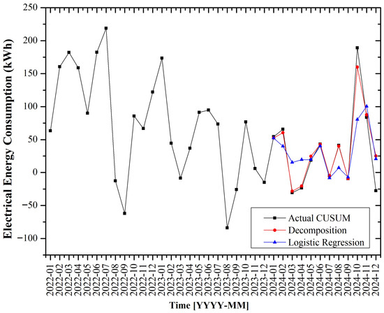 From Figure 6, which shows the forecast of the CUSUM trend from January to December 2024, it was observed that the decomposition model yielded predictions that were most closely aligned with the actual trend. This can be attributed to the model’s ability to separate trend and seasonal components from residuals, thereby minimizing the influence of short-term anomalies and allowing for a more accurate understanding of temporal patterns. In contrast, the logistic regression model lacks the capability to account for time-dependent structures, which limits its forecasting performance in this context.