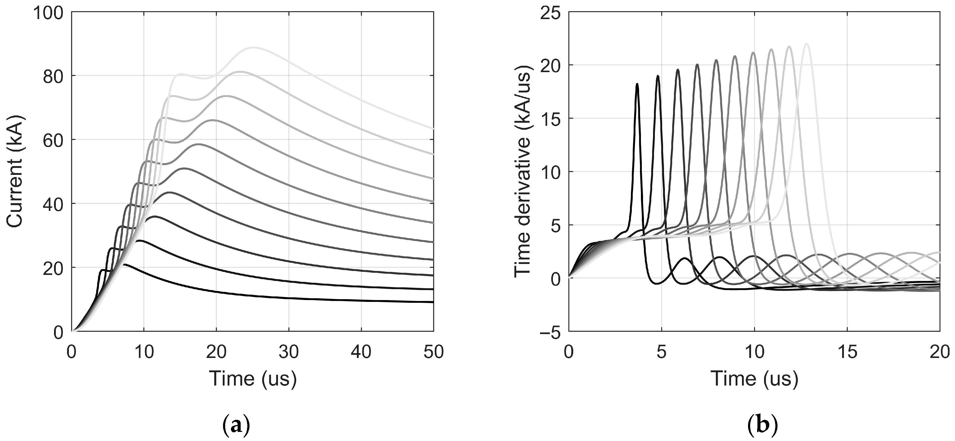 - Oliveira, A.J.; Schroeder, M.A.O.; Moura, R.A.R.; Correia de Barros, M.T.; Lima, A.C.S. Adjustment of Current Waveform Parameters for First Lightning Strokes: Representation by Heidler Functions. In Proceedings of the 2017 International Symposium on Lightning Protection (XIV SIPDA), Natal, Brazil, 2–6 October 2017; pp. 121–126. [Google Scholar]