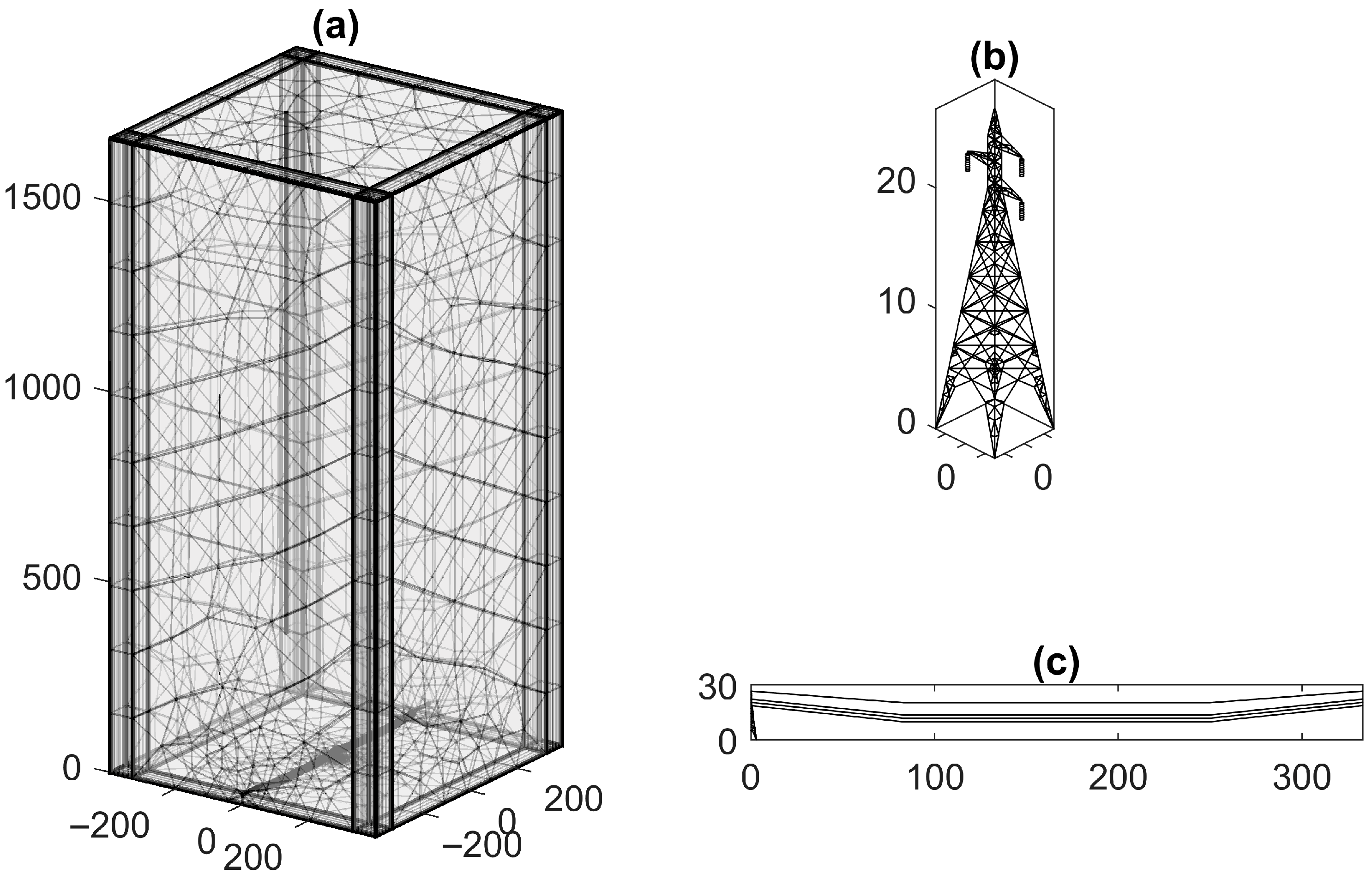 - Lateral stroke position (x): Uniformly distributed within a ±500 m corridor centered on the transmission line, representing the horizontal displacement of the downward leader channel relative to the tower.