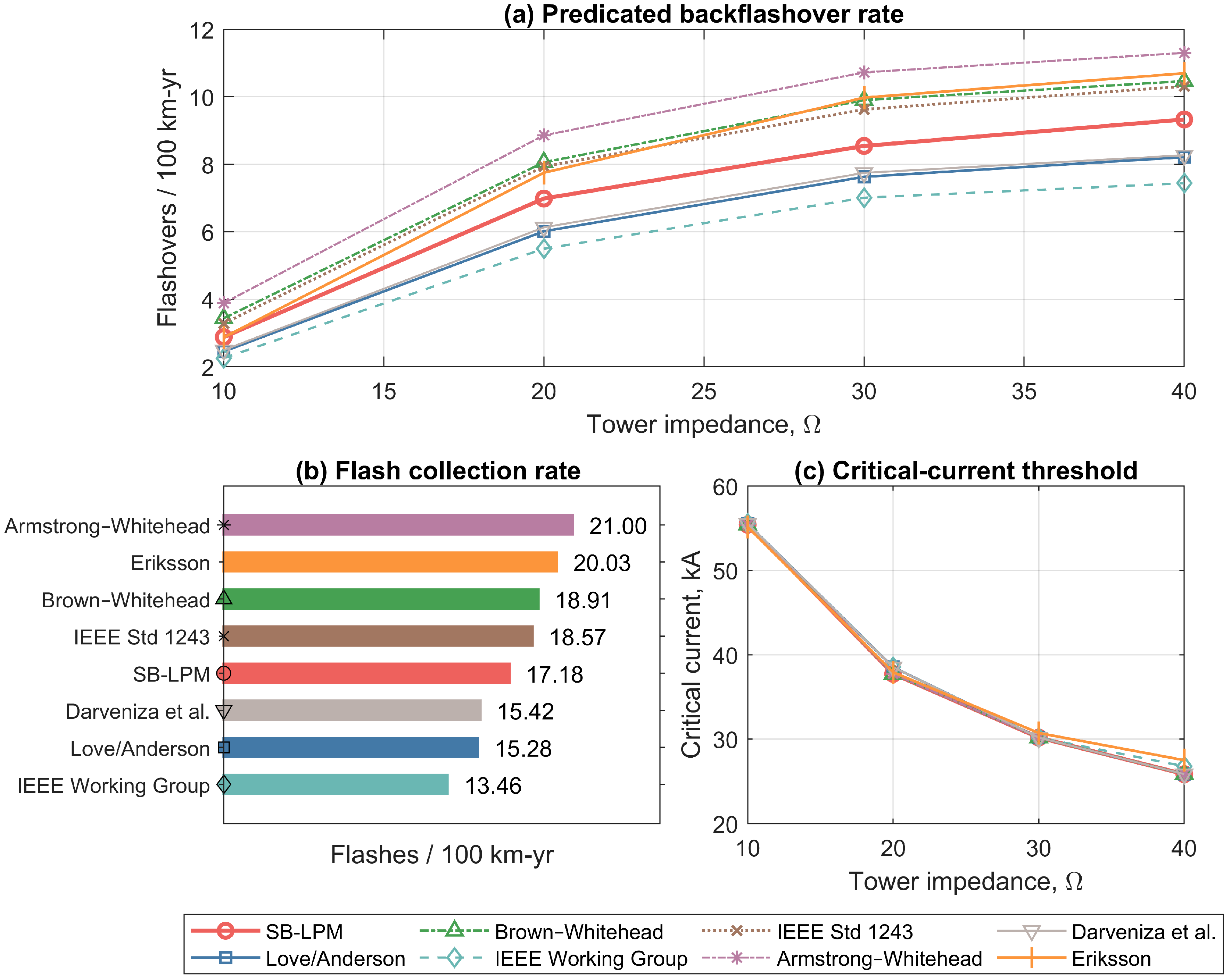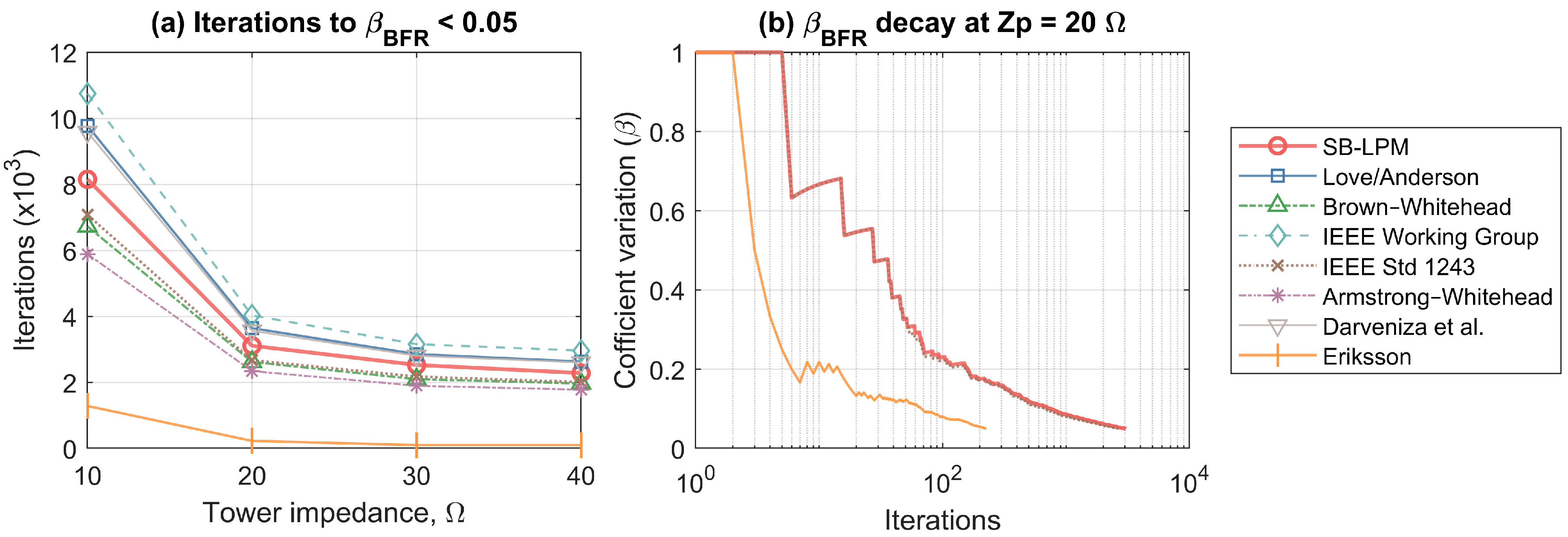 - Panel (a): iterations required to reach convergence across tower-footing impedance for all attachment models. This comprehensive comparison highlights the considerable variability in convergence effort associated with different stroke incidence formulations.