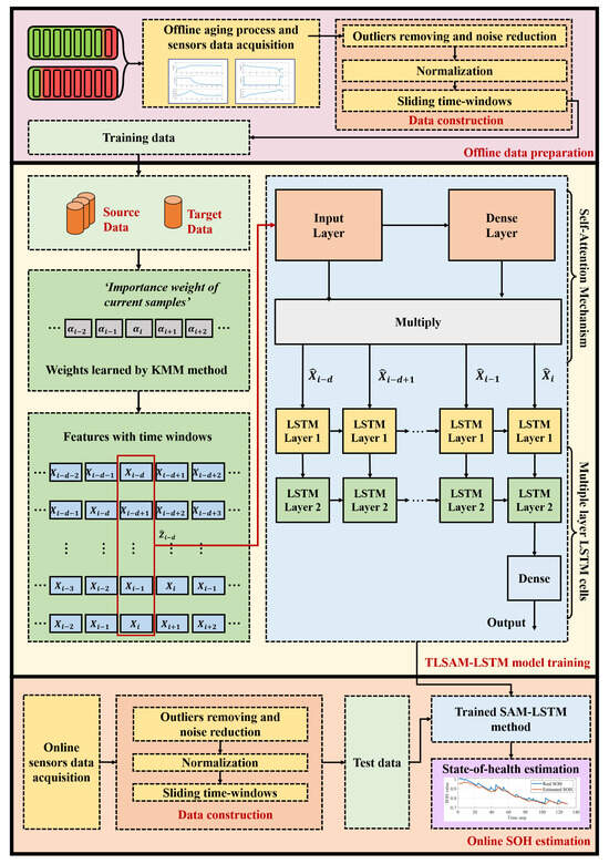 This section elaborates the proposed TLSAM-LSTM method, with its comprehensive framework depicted in Figure 2. The implementation integrates four core components: (1) temporal instance re-weighting via kernel mean matching (KMM) to adjust sample significance, (2) feature prioritization through a self-attention mechanism that dynamically assigns higher weights to critical spatial features, (3) deployment of long short-term memory (LSTM) networks as the base estimator for SOH prediction, and (4) execution of pre-training with fine-tuning strategies to facilitate cross-domain adaptation. This cohesive architecture enables effective information extraction while ensuring domain transfer robustness.