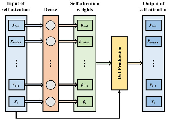 The self-attention mechanism serves as a critical component for assigning temporal and feature weights, enabling enhanced extraction of relevant information from datasets. Following sliding time-window processing, data pairs are obtained at each timestep t during training, where represents a two-dimensional matrix of dimensions (m: sensor dimensions, d: window length). The detailed architecture is illustrated in Figure 3. Given with , the self-attention layer computes feature importance weights through linear transformation followed by sigmoid activation: