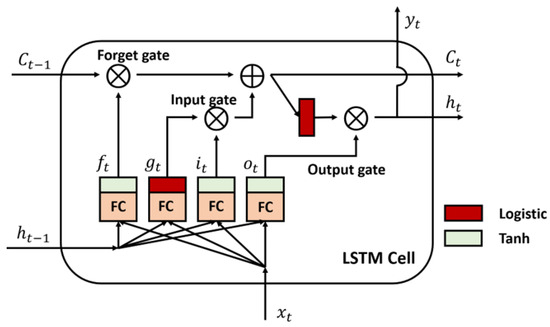 where means output of forget gate, aiming at control long-term memory retention state. is output of input gate, with to decide to join long-term memory information. Output gate is used to control long-term memory and add it to short-term memory in Equation (13). represents weight connection with input variables and with hidden states (short-term memory). are biased terms.