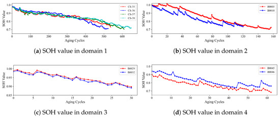 The Center for Advanced Life Cycle Engineering (CALCE) from the university of Maryland has published batteries aging datasets, with the aging process of charging and discharging stages [32]. The detailed parameters of these different domains can be seen in Table 1. The SOH value with aging cycles is shown in Figure 6. First, batteries are charged in the constant current (CC) mode until the voltage reaches 4.2 V, and then charged in the constant voltage (CV) mode until the charging current drops to 20 mA. Then, batteries are discharged in constant current (CC) mode until reaching the drop-out voltage . The related rated capacity is 1.1 Ahr, which drops to 30% generally when batteries reach the end of life (EOL). Another widely used NASA batteries benchmark is from a real-world experiment [33]. Four similar ‘18650’ battery cells include B05, B06, B07, and B18, which are under a rated capacity around 2 Ahr. There are also other experiments in NASA, including the B29, 30, 31, 32 and the B45, B46, B47, B48 with different operating conditions. The frontier cells are worked in large current , and the latter cells are worked in low ambient temperature . For LIBs’ run-to-failure benchmark, this paper uses the CALCE and NASA datasets with four different operating conditions in real-world experiments.