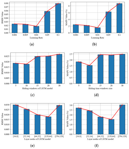Compared results of TLSAM-LSTM model hyper-parameters. (a) RMSE value of learning rate; (b) MAPE value of learning rate; (c) RMSE value of sliding time windows; (d) MAPE value of sliding time windows; (e) RMSE value of layer nodes; (f) MAPE value of layer nodes.
