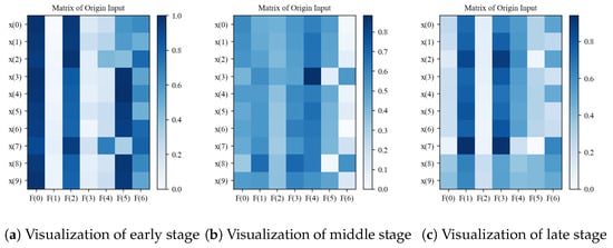 We conducted a self-interpretability analysis of the TLSAM-LSTM framework to elucidate its internal mechanisms. Figure 8 visualizes input data matrices across three battery aging stages: (a) early-stage (first aging cycle), (b) mid-stage (50% EOL cycles), and (c) late-stage (80% EOL cycles). In these visualizations, the Y-axis represents sliding time-window instances () while the X-axis denotes sensor-derived features (), with color intensity indicating degradation severity. Although spatial data points exhibit discernible patterns, their relative importance remains indeterminate prior to processing.