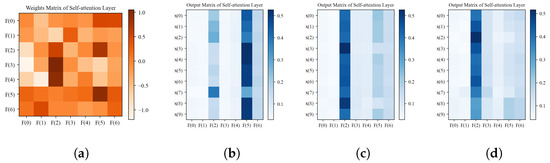 Visualization of self-attention layers. (a) Weight matrix visualization of self-attention layers; (b) output visualization of early stage; (c) output visualization of middle stage; (d) output visualization of late stage.