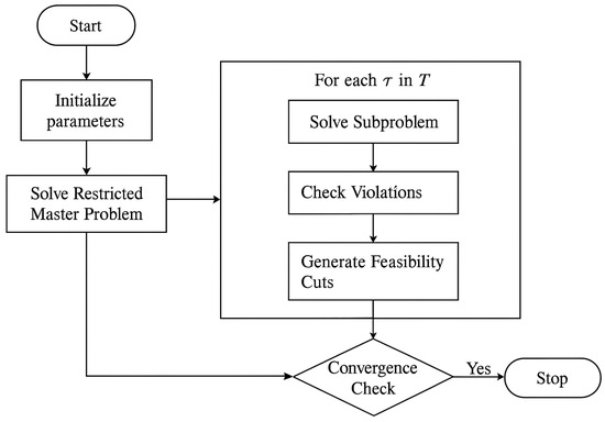 is evaluated through subproblem solving, which checks the feasibility of the provisional solution under scenario-specific operational conditions. If violations are detected—such as instability in voltage or frequency—corresponding feasibility cuts are generated to refine the master problem. This loop continues until all scenarios satisfy the operational constraints within the specified tolerance. At the convergence check stage, the algorithm determines whether further iterations are required; if not, the process terminates and the optimal robust solution is obtained. The structured nature of this algorithm allows for systematic tightening of the feasible set, ensuring that the final decision is both cost-efficient and resilient to worst-case uncertainties.