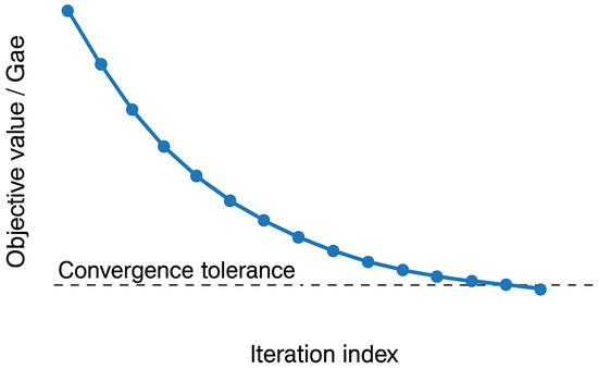 . Starting from a high initial cost, the algorithm exhibits a monotonic decrease in the objective value as iterations progress, reflecting the progressive refinement of the solution through sequential master problem and subproblem updates. The dashed line marks the predefined convergence tolerance, which serves as the termination criterion. Once the objective value falls below this threshold, further improvements are negligible, indicating that the solution has stabilized. The smooth and consistent downward trajectory, without oscillations or abrupt jumps, confirms both the stability and robustness of the algorithm’s iterative refinement process. This behavior validates the computational efficiency of the proposed method in reaching high-quality solutions within a limited number of iterations.