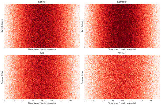 Figure 3 visualizes the temporal–spatial variability of photovoltaic generation across four seasonal clusters—spring, summer, fall, and winter—each containing 100 empirically generated daily PV output samples with a 15 min resolution over a 24 h period (96 intervals). The