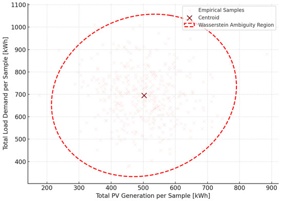 Figure 4 presents a two-dimensional projection of the joint empirical distribution of total daily photovoltaic (PV) generation and corresponding total daily load demand across 400 historical samples. Each point in the scatter cloud represents a single-day realization, with PV generation ranging from approximately 300 kWh to 750 kWh, and load demand spanning from 450 kWh to over 1000 kWh. The color tone uses a soft red palette to emphasize density while maintaining visual elegance. The concentration of points around the centroid—located at approximately (503.6 kWh, 697.9 kWh)—reflects the overall system balance under average solar and demand conditions. However, the cloud exhibits strong anisotropy, indicating that load and PV generation are not perfectly correlated: while there is some degree of alignment (correlation coefficient ≈ 0.43), variations in cloud width suggest the presence of substantial distributional uncertainty orthogonal to the mean demand–supply trend. Superimposed on the scatter cloud is a red elliptical contour that represents the Wasserstein ambiguity ball constructed around the empirical centroid. This contour is derived from the covariance structure of the joint distribution and reflects a confidence region that bounds worst-case plausible variations in both PV and load. The ellipse has a major axis of approximately 290 kWh and a minor axis of about 175 kWh, corresponding to 3 standard deviations in each principal direction of the joint covariance matrix. The shape of the ellipse is tilted upward from left to right, reinforcing the observation of partial correlation between PV availability and demand magnitude across daily realizations. From an optimization perspective, this contour defines the support of the ambiguity set used in the distributionally robust problem. The Wasserstein DRO model minimizes expected cost over all distributions within this set, thereby hedging against variations that deviate not just in magnitude but also in structure from the empirical mean.