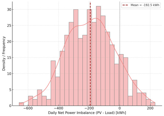 Figure 5 illustrates the empirical distribution of net daily power imbalance, defined as the difference between total daily PV generation and total daily load demand, across 400 historical samples. The
