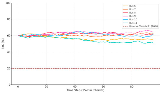 Figure 6 illustrates the temporal evolution of the state-of-charge (SoC) levels for six representative GFES-equipped buses over a full 24 h operating horizon, discretized into 96 time steps (15 min intervals). The trajectories reflect the optimal dispatch strategy derived from the robust planning model, incorporating both energy adequacy and reserve management constraints. All trajectories are bounded between 15% and 90% of the total capacity, with a red dashed threshold at 20% marking the minimum reserve margin required for black-start compliance. Across the buses, initial SoC values are clustered around 60–65%, and dynamic behavior varies according to local load profiles and PV output correlation. For instance, Bus 9 maintains a relatively flat SoC curve with moderate fluctuations, indicating that it serves as a balancing node with predictable energy flow. In contrast, Bus 12 exhibits more aggressive cycling, with two full discharging events and one recharging ramp, indicating response to localized generation or load swings. The reserve threshold line at 20% is never crossed, demonstrating that the optimizer respects the black-start feasibility constraint. Interestingly, in at least two buses (Bus 8 and Bus 13), the SoC dips close to the reserve floor around time steps 40–60 (10:00–15:00), which corresponds to peak load hours in the test case. This suggests that the optimizer schedules these units for heavy discharging during system-wide stress conditions, while still preserving the regulatory minimum needed to support voltage and frequency restoration. The presence of mid-day recharge periods in Buses 6 and 14 suggests good alignment between PV output peaks and charging demand, which is a desirable emergent behavior and indicates tight coordination between storage and generation assets.