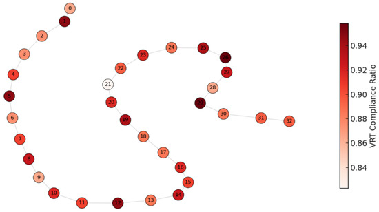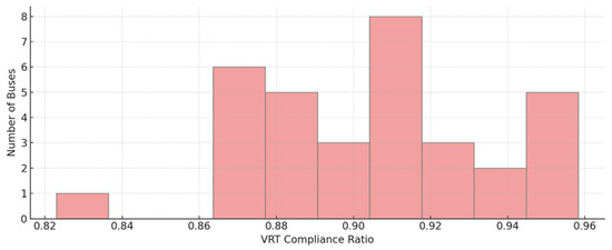 Figure 8 maps VRT performance onto the IEEE 33-bus topology using a spring layout. Node color represents average VRT compliance, with deeper red indicating worse performance. Several peripheral nodes (e.g., nodes 28–32) exhibit lower compliance, likely due to their topological distance from voltage-regulating sources or from hosting high-ramp-rate PV. Conversely, central nodes (e.g., 6, 13, 17) show strong compliance, benefiting from proximity to GFES installations or having low reactive loading. This visual pattern confirms the sensitivity of VRT to both electrical distance and local power volatility. The map also reveals some surprisingly low scores at intermediate nodes—possibly due to co-location of volatile loads and weak network impedance—which may be overlooked if only endpoint nodes are analyzed. This figure strongly supports the inclusion of spatially resolved control constraints in the model. Instead of enforcing system-wide average metrics, the planner must recognize that VRT feasibility is highly nodal and time-sensitive. By quantifying compliance across space and time, the model avoids over-allocating GFES to well-performing nodes while under-protecting vulnerable ones. These VRT distributions also affect the penalty structure in the objective function (Equation (4)), where each underperforming node contributes to resilience loss. Overall, this figure confirms that robust control-aware planning is essential to maintain voltage stability in islanded microgrids with high renewable uncertainty.