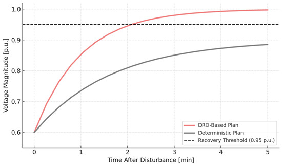 y-axis shows the per-unit (p.u.) voltage magnitude. Both recovery trajectories begin at 0.6 p.u., simulating an undervoltage event caused by a system-wide perturbation. The black dashed line at 0.95 p.u. denotes the voltage recovery threshold, below which voltage-sensitive equipment may trip and system integrity may be compromised. The DRO-based trajectory rises sharply, reaching 0.95 p.u. in approximately 2.1 min. This response is characterized by a steeper slope in the first 90 s, indicating rapid inverter-based voltage support and higher system stiffness due to robustly positioned GFES units. In contrast, the deterministic trajectory recovers more slowly, reaching only 0.90 p.u. by minute 3 and asymptotically approaching 0.95 p.u. around minute 4.5. This slower recovery implies a weaker frequency–voltage control reserve, likely due to suboptimal placement or undersizing of GFES at dynamically sensitive nodes. The difference in trajectories is a direct consequence of including voltage ride-through metrics (Equation (13)) and frequency dynamic constraints (Equation (12)) in the DRO model, which push the optimization to account for worst-case disturbances and enhance recovery margins.