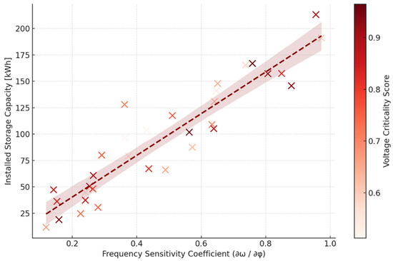 Figure 10 reveals a clear, positive correlation between the node-level frequency sensitivity coefficient and the installed grid-forming energy storage (GFES) capacity, illustrating a core behavioral outcome of the robust optimization model. The