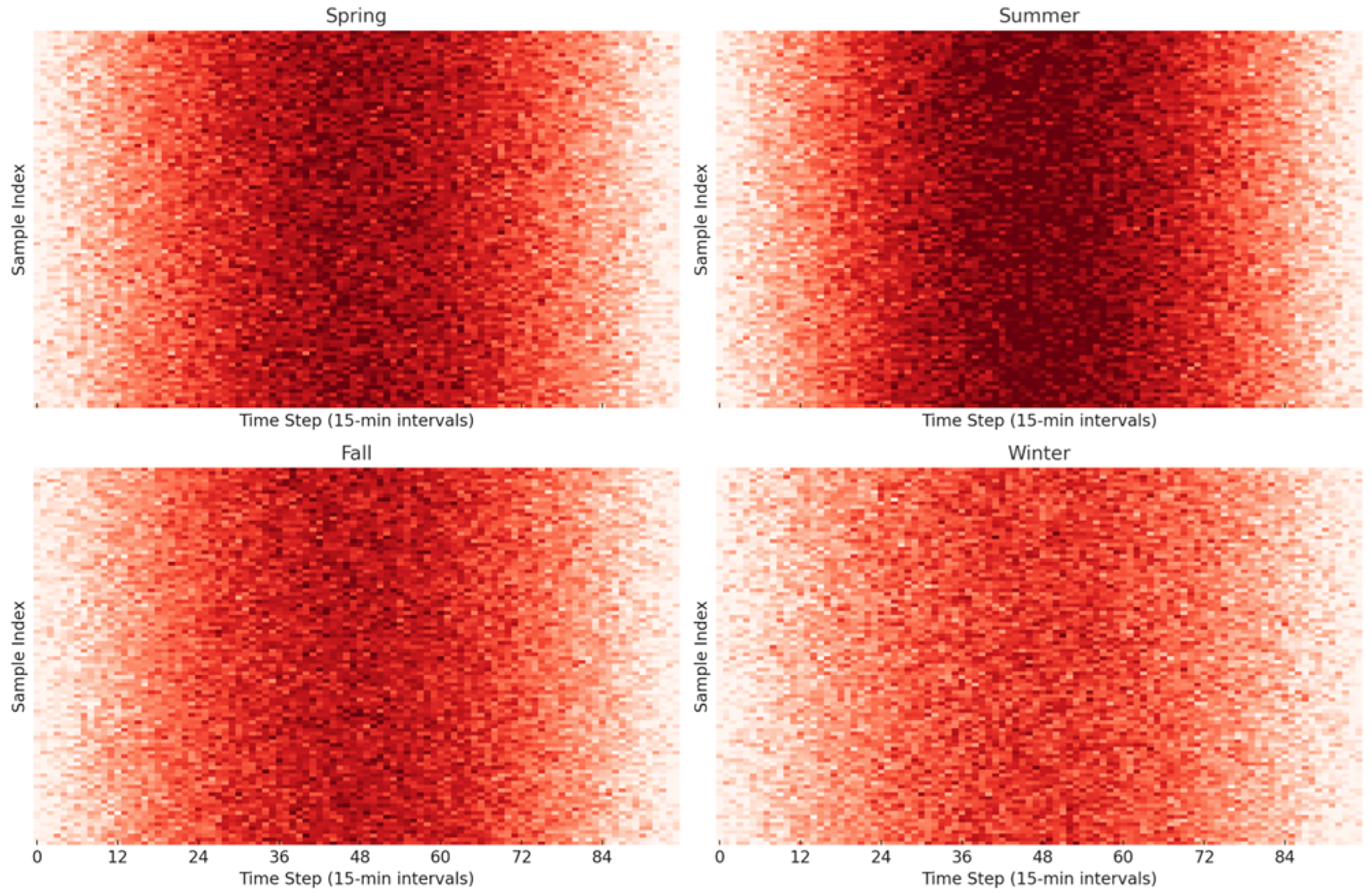 Figure 3. Normalized ensemble of seasonal PV generation profiles across 400 samples (15 min resolution).