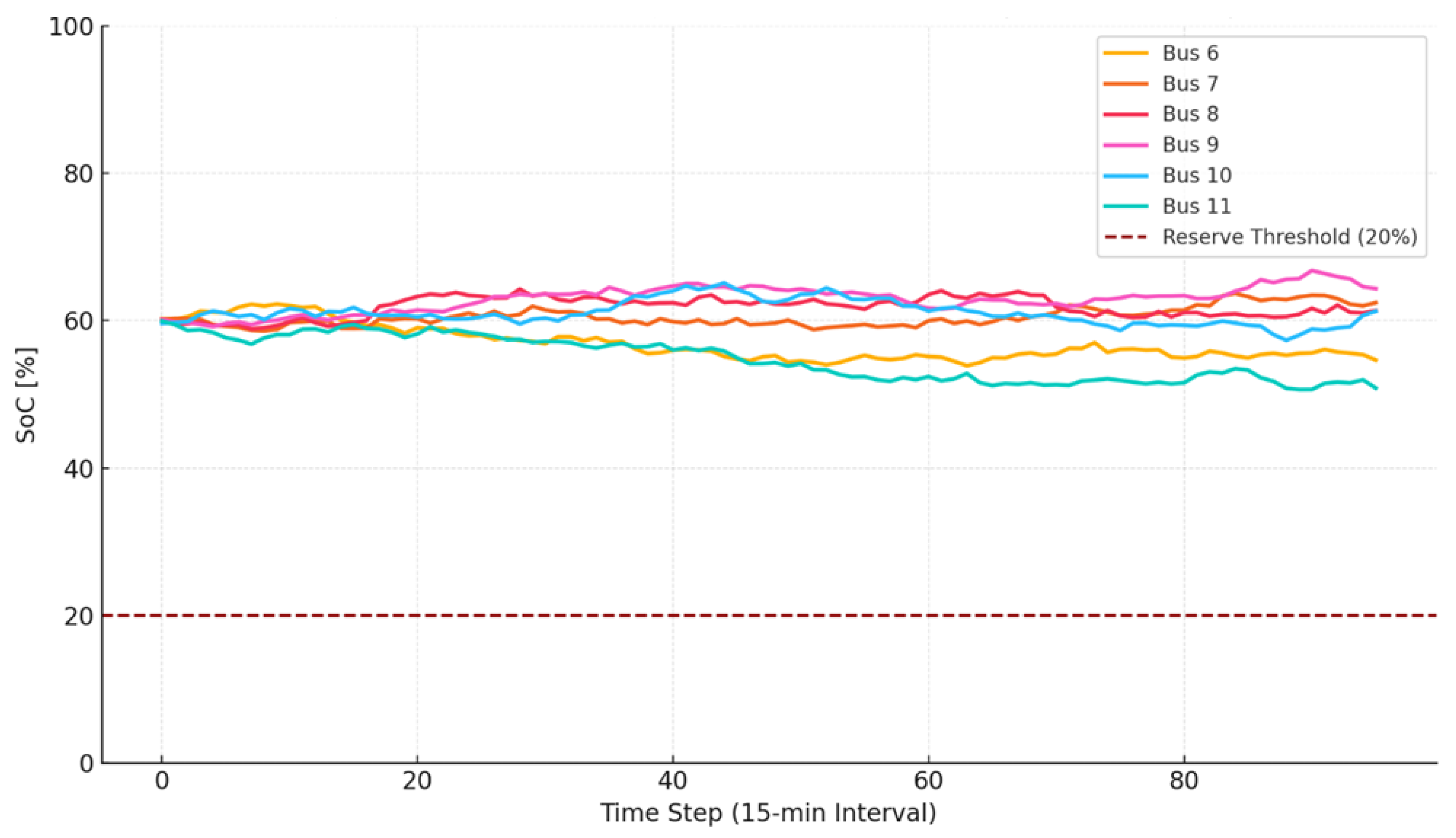 Figure 6. State-of-charge trajectories over 24 h (selected buses).