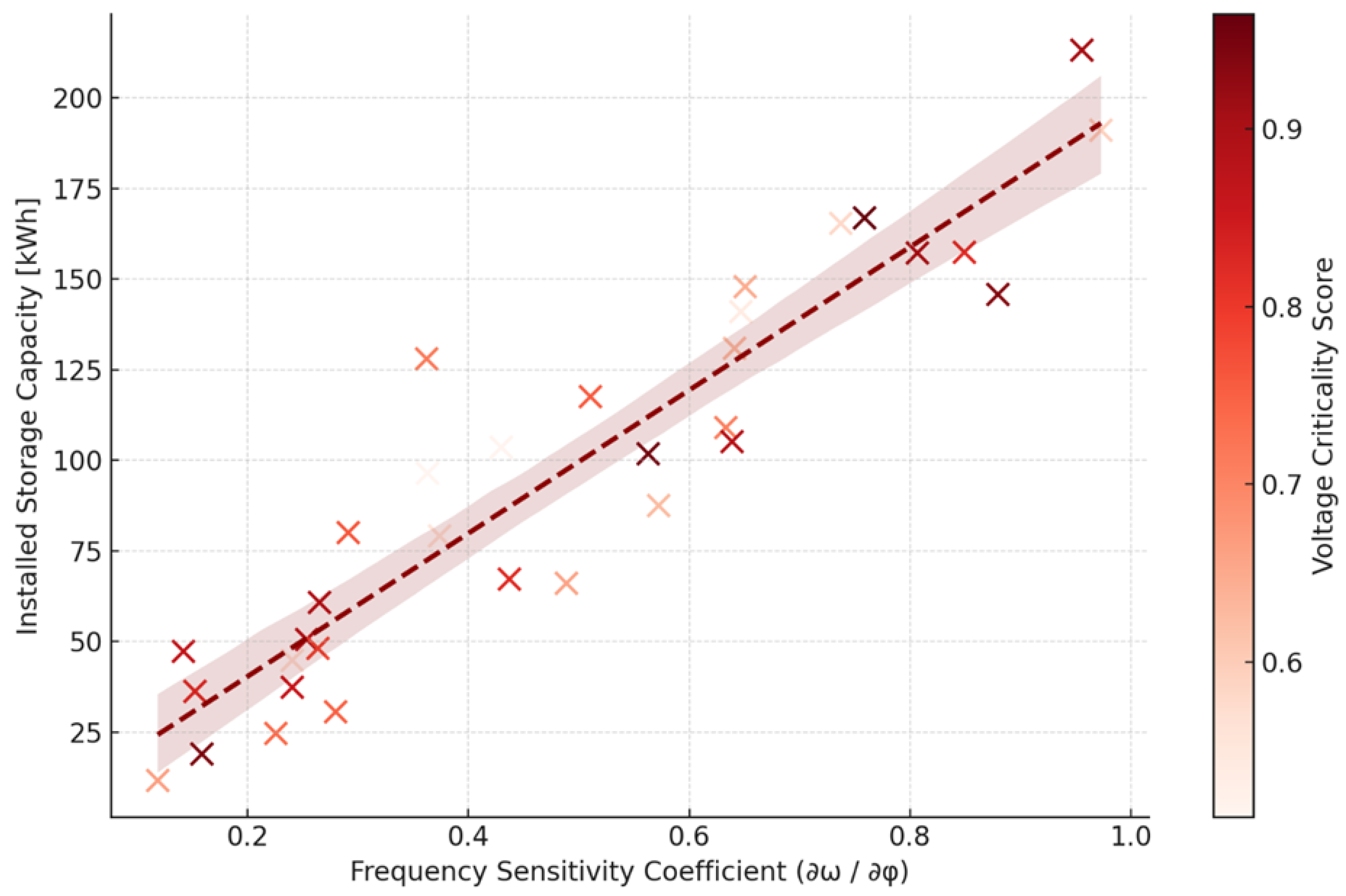 Figure 10. Nodal storage deployment vs. frequency sensitivity correlation.