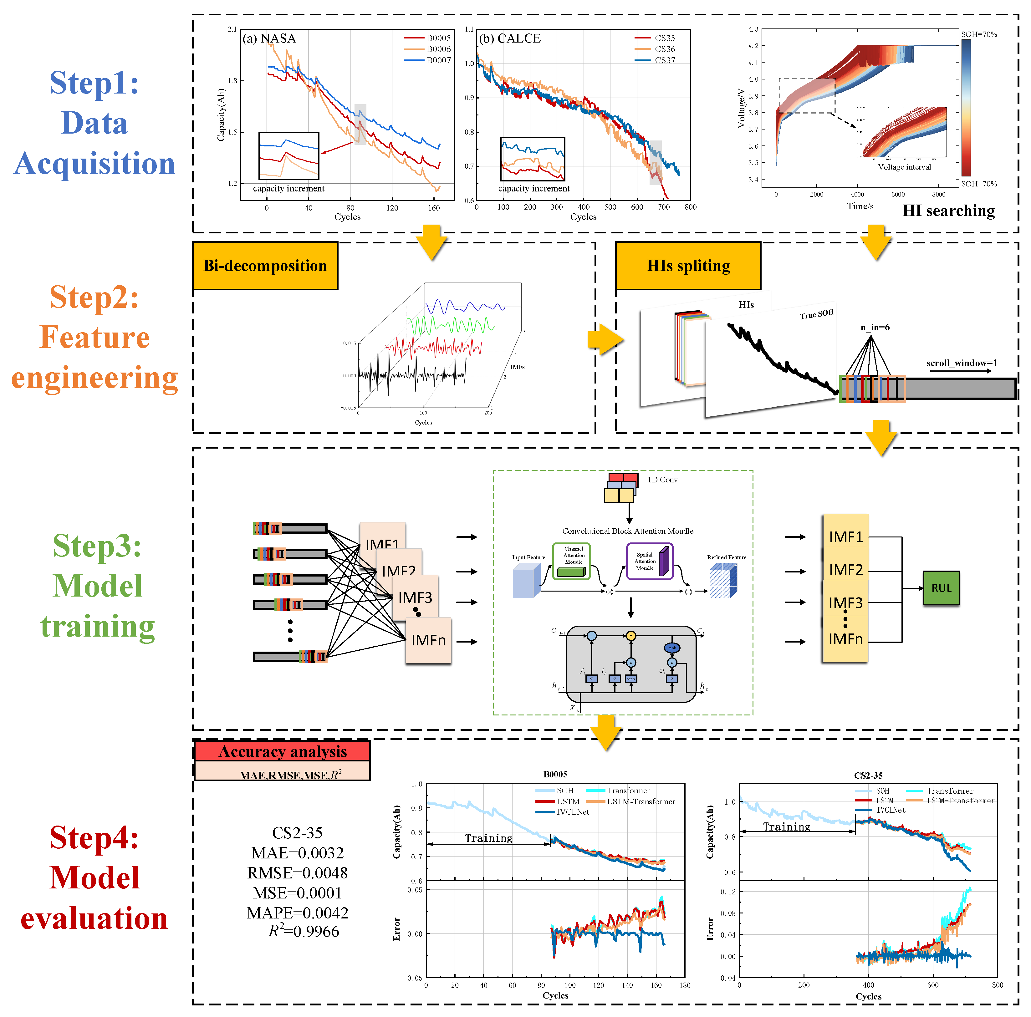 APA StylePei, Y., Huo, H., Guo, Y., Kang, S., & Xu, J. (2025). IVCLNet: A Hybrid Deep Learning Framework Integrating Signal Decomposition and Attention-Enhanced CNN-LSTM for Lithium-Ion Battery SOH Prediction and RUL Estimation. Energies, 18(21), 5677. https://doi.org/10.3390/en18215677