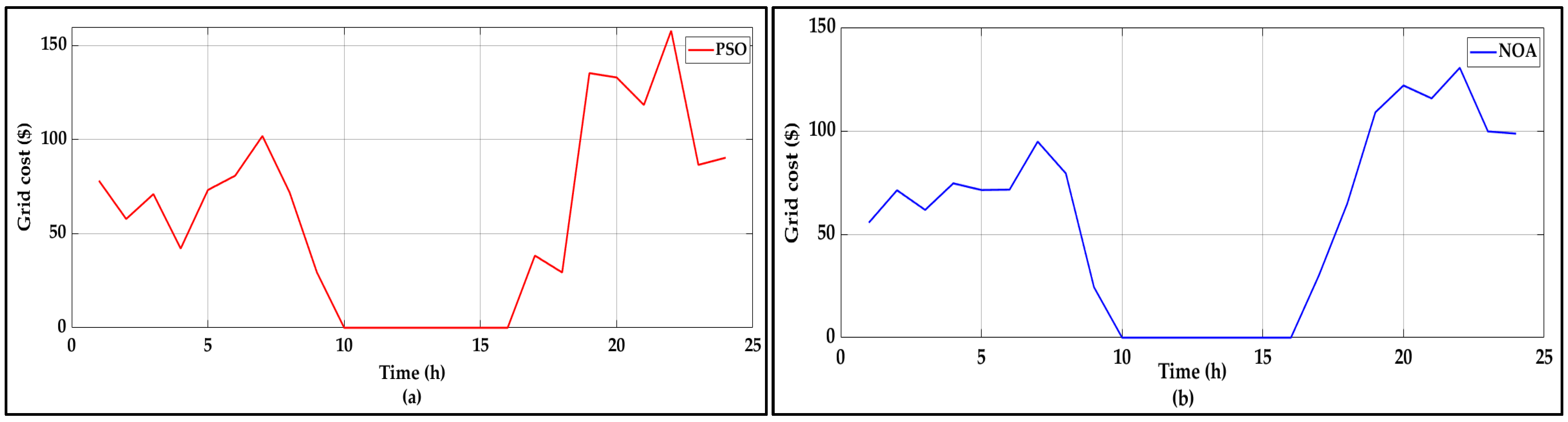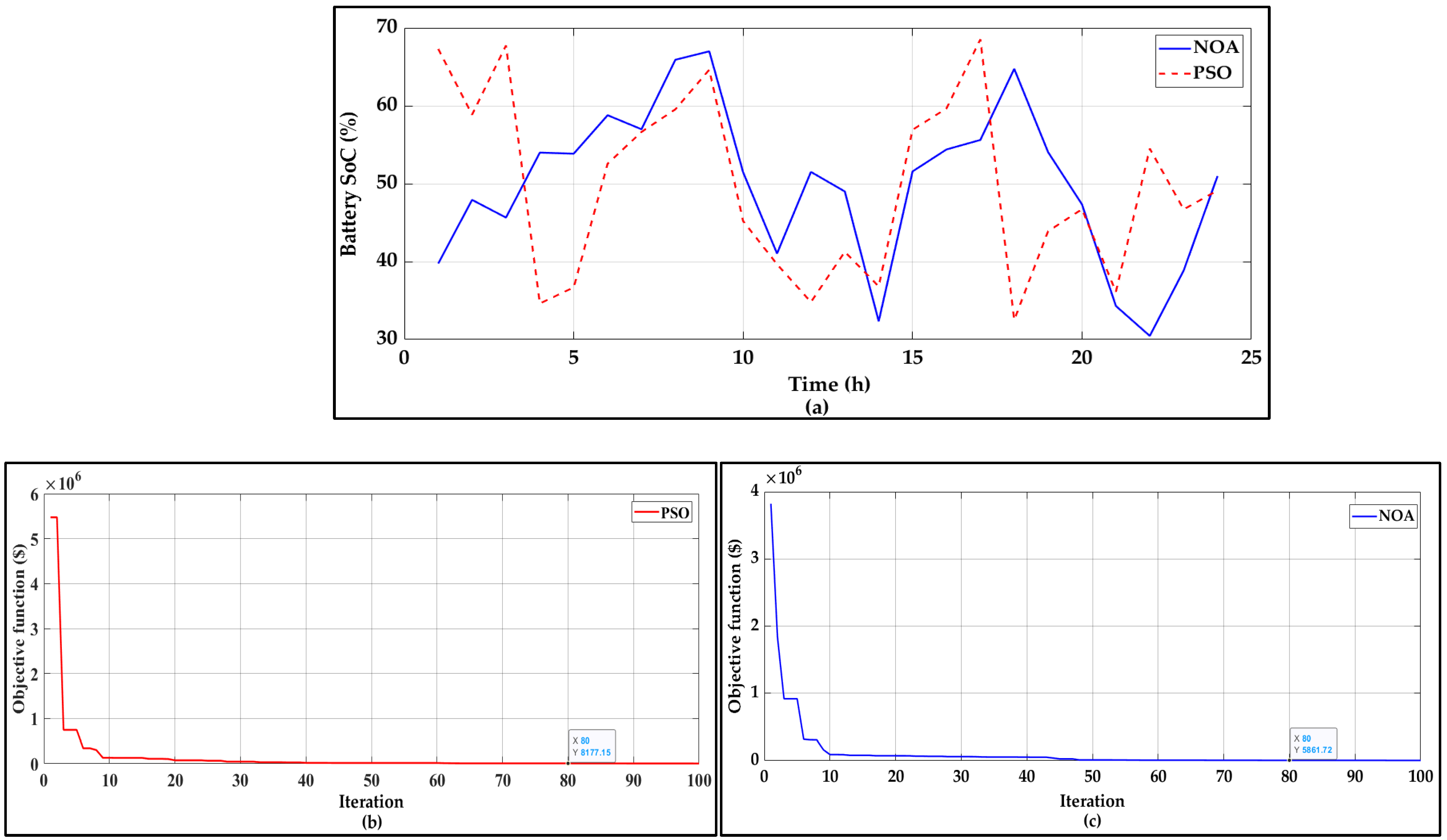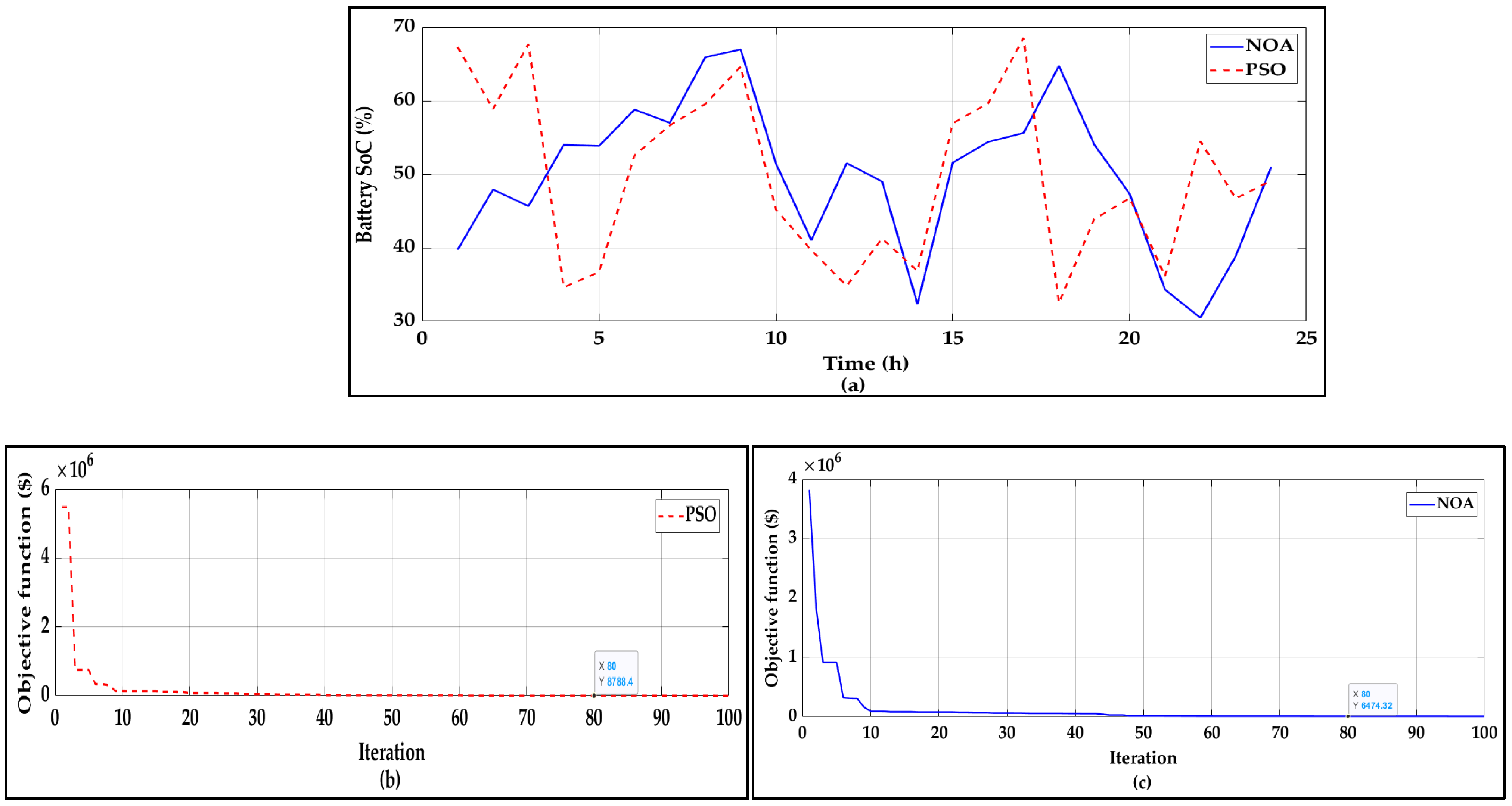 - Comparative performance evaluation via MATLAB simulations under various weather conditions is conducted for the proposed and well-known EMS methods. The NOA-based EMS proposed shows faster convergence, better dynamic response, and higher economic performance (total cost reduction of USD 17–34, and the degradation cost is 27% lower).