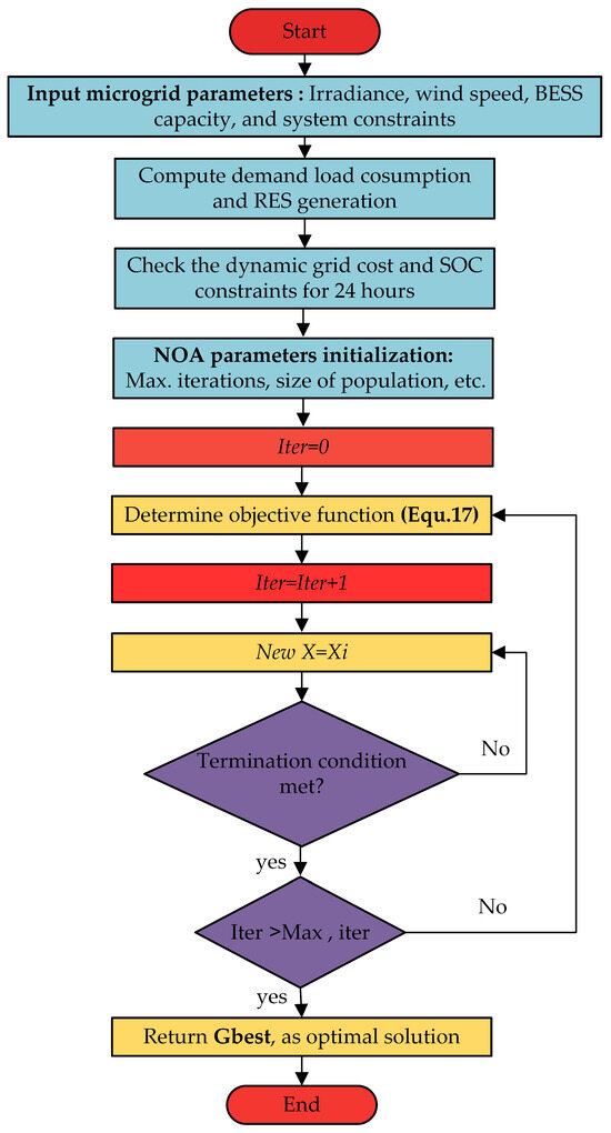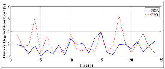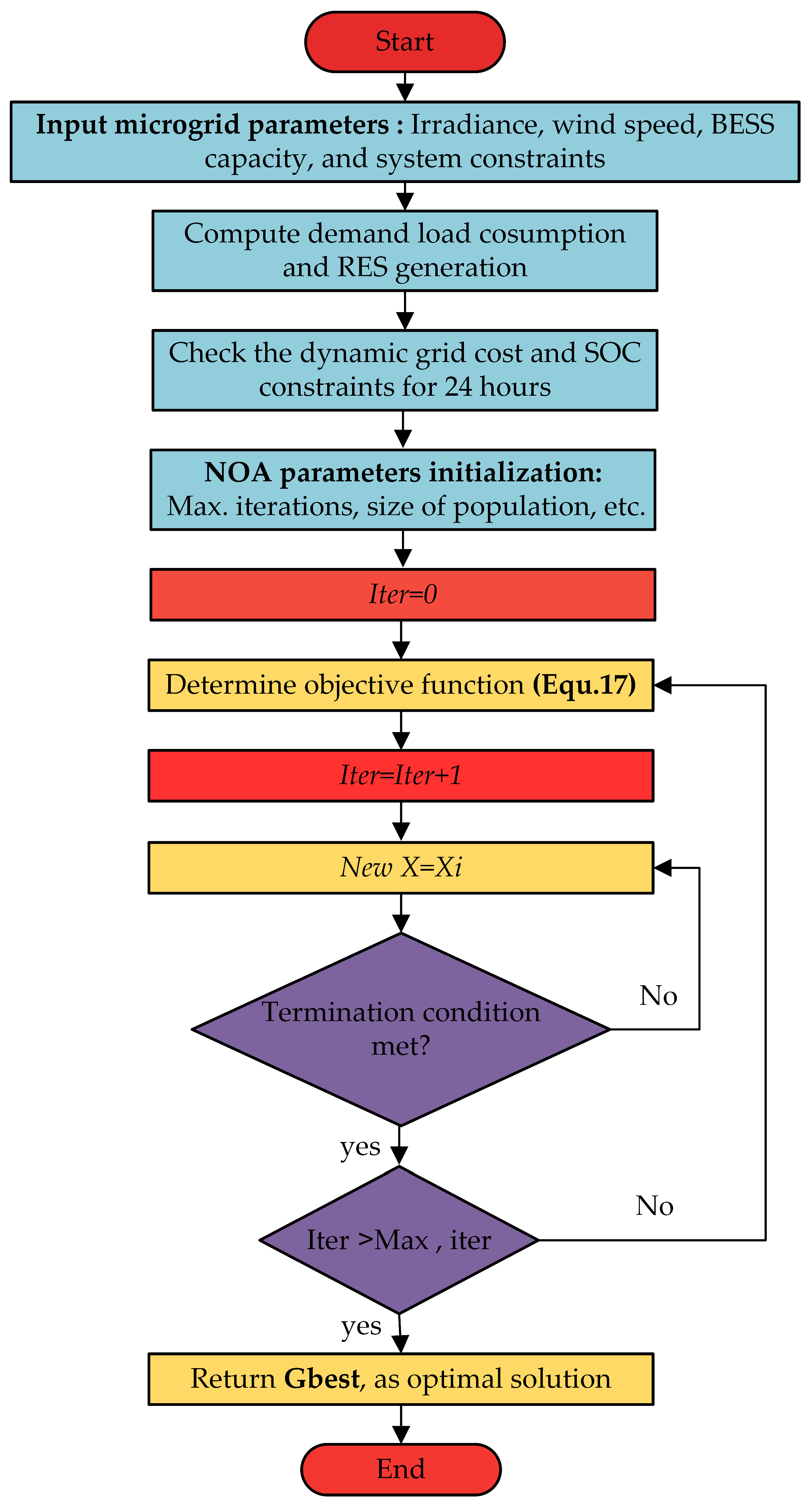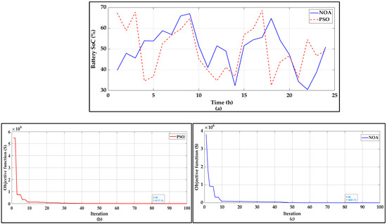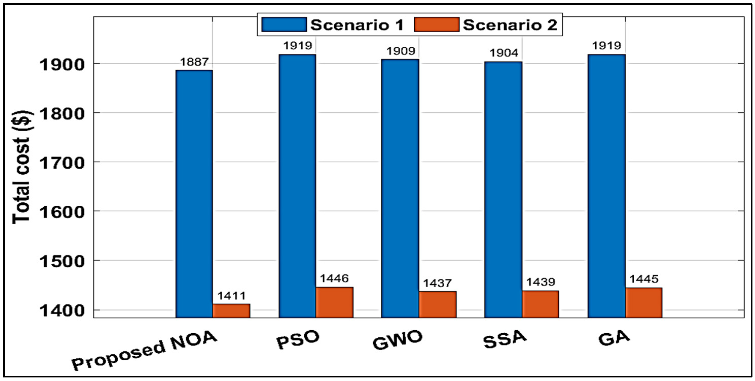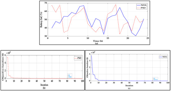 - Comparative performance evaluation via MATLAB simulations under various weather conditions is conducted for the proposed and well-known EMS methods. The NOA-based EMS proposed shows faster convergence, better dynamic response, and higher economic performance (total cost reduction of USD 17–34, and the degradation cost is 27% lower).